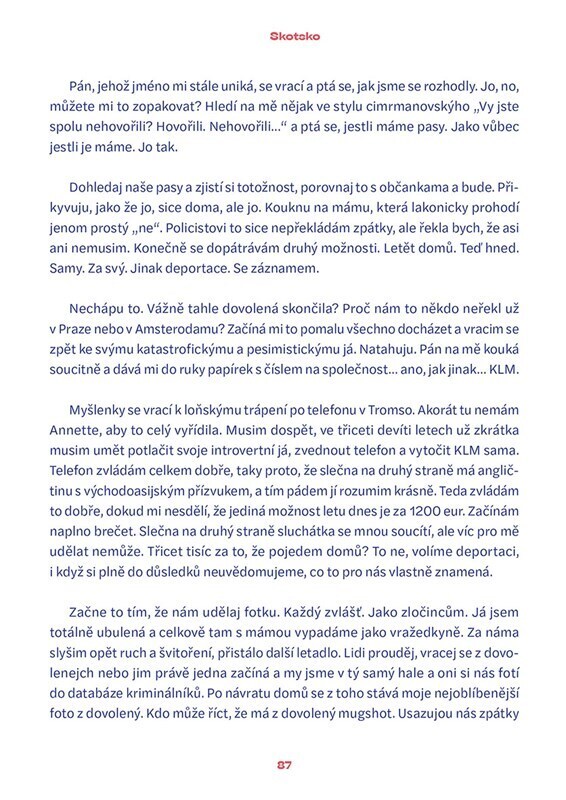 Herečka a fotografka se smyslem pro humor, s touhou neustále někam utíkat, nejlíp za polární kruh, na svých cestách ráda a často fotí. Co je ale důležitější, dějou se jí všelijaký katastrofy. Na Islandu zapadne na osamělé silnici s autem do závěje, letenky z Norska jí propadnou a ze Skotska jí...