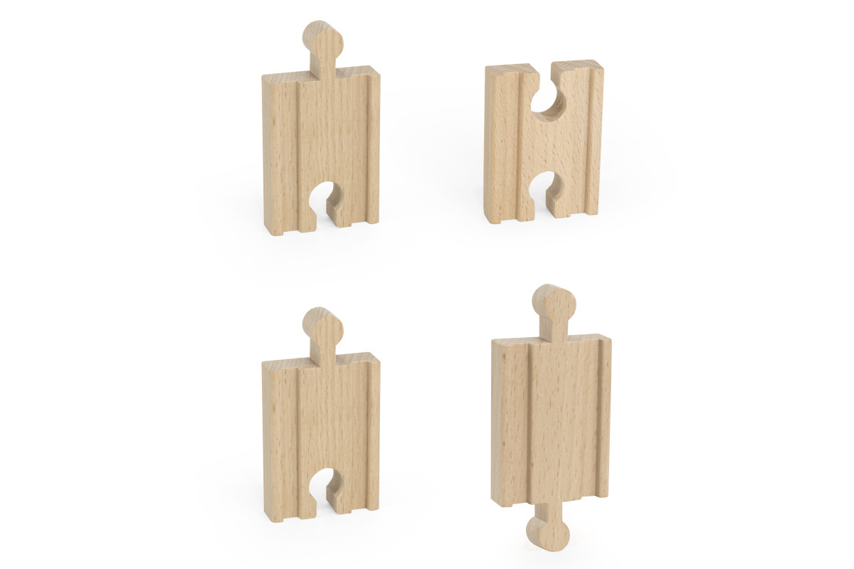 Balení 4 ks rovných krátkých kolejí. Tyto koleje značky Viga jsou kompaktibilní s kolejemi značky Maxim a dalšími dostupnými značkami dřevěných kolejí. Baleno v sáčku. Rozměry kolejí cca 7x4x1 cm. Věk 3+