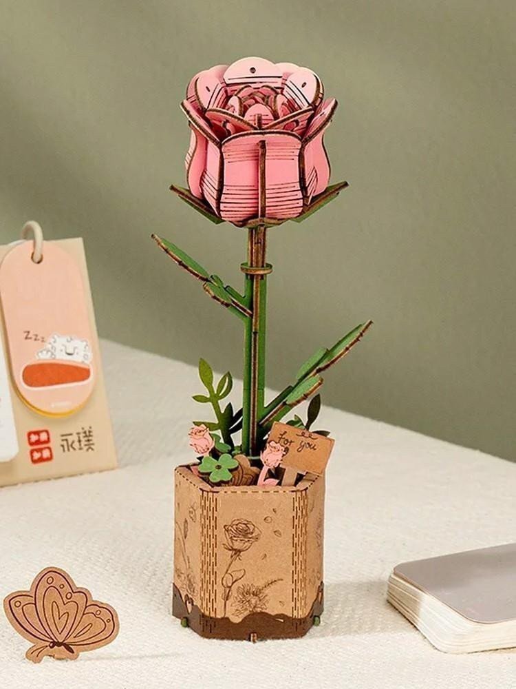 Dřevěné 3D puzzle. Poskládej si propracovaný model růžové růže s krásnými detaily a barvami za pomoci obrázkového návodu. V bale...