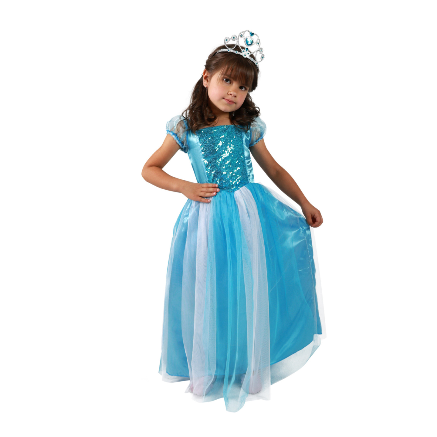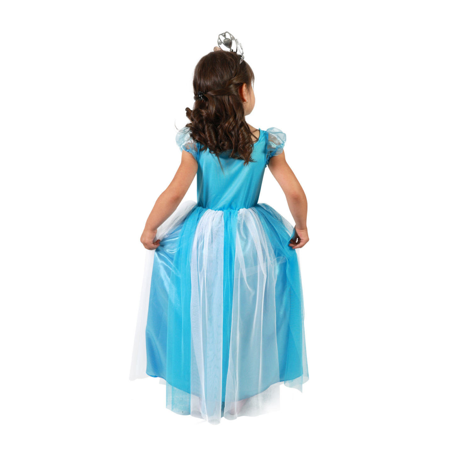 Úchvatný dívčí kostým pro princezny! Kostýmek modré barvy je kombinován s bílým tylem a v horní části dekorován modrými flitry. Kostým princezny ve velikosti S je určen pro holčičky ve věkovém rozmezí 4-6 let (105-116 cm).