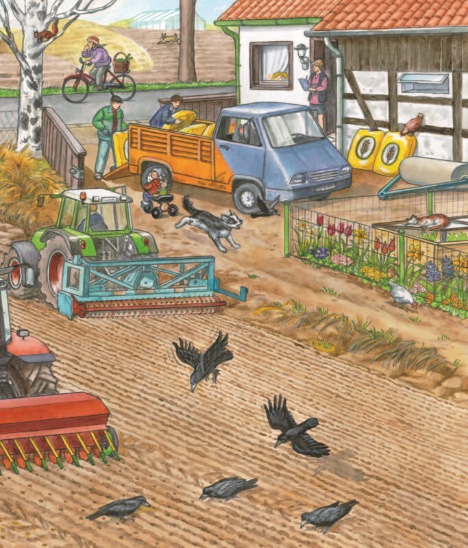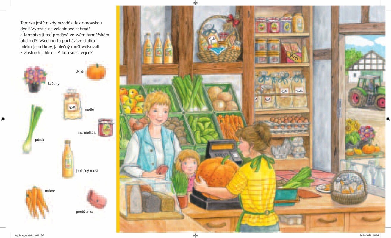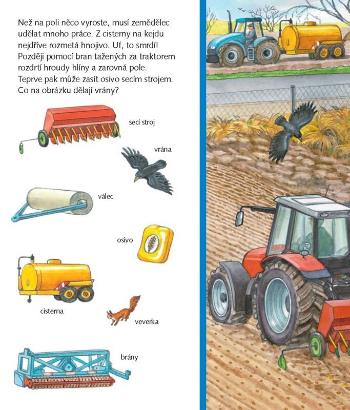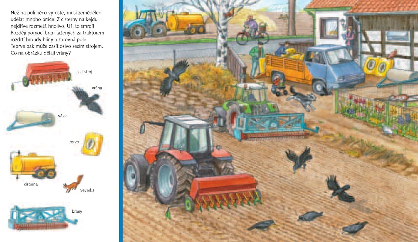 Na statku je spousta práce! Musí se zorat pole, sklidit obilí nebo posekat louka. Najdeš na obrázku cisternu, lopatu nebo třeba kohouta?