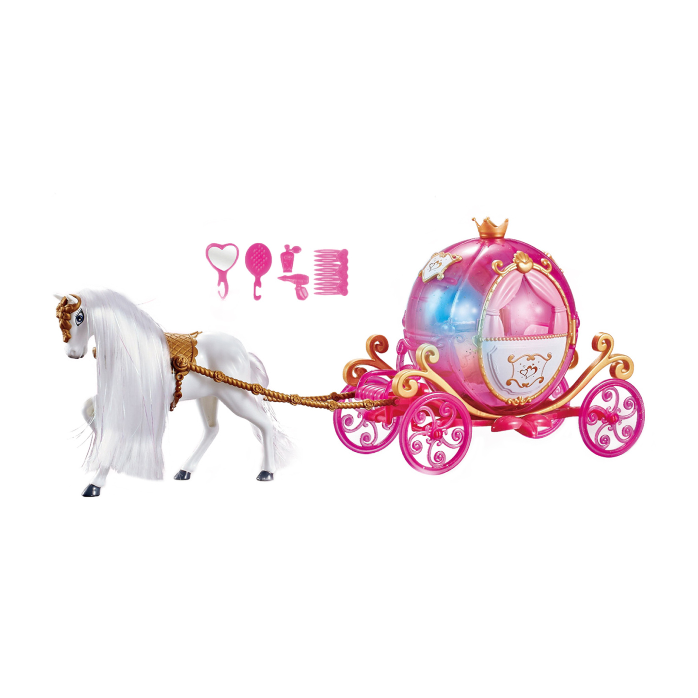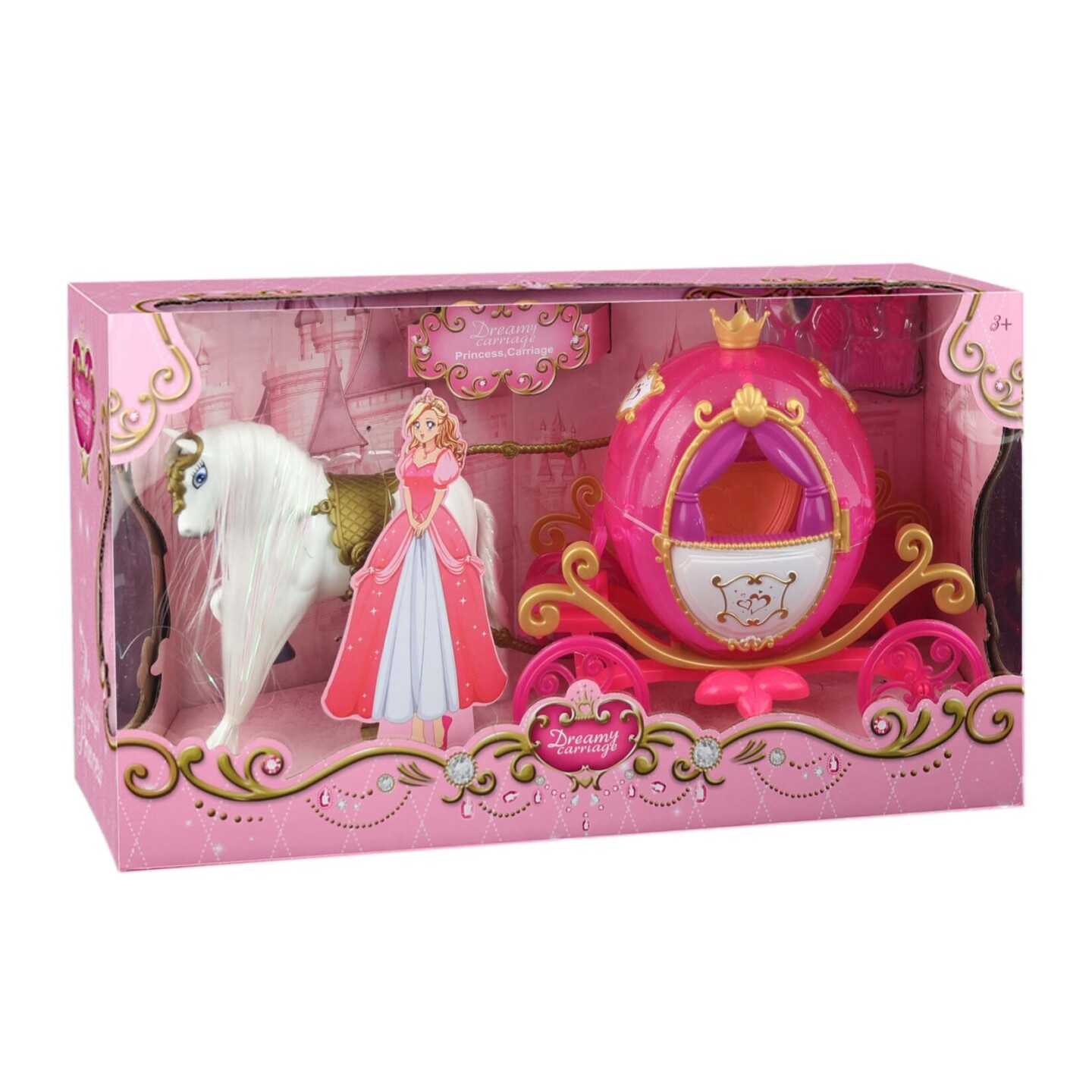 Bílý kůň s dlouhou hřívou zapřáhnutý do růžovéhop pohádkového kočáru. Každá panenka si bude přát vyrazit v něm na zámecký bál! Kůň má krásnou bílou hřívu, kterou můžeš česast přiloženými hřebeny. Kočár funguje na 3x1,5V baterie typu AG13, po zapnutí vydává reálné zvuky, hraje hudba a bliká....