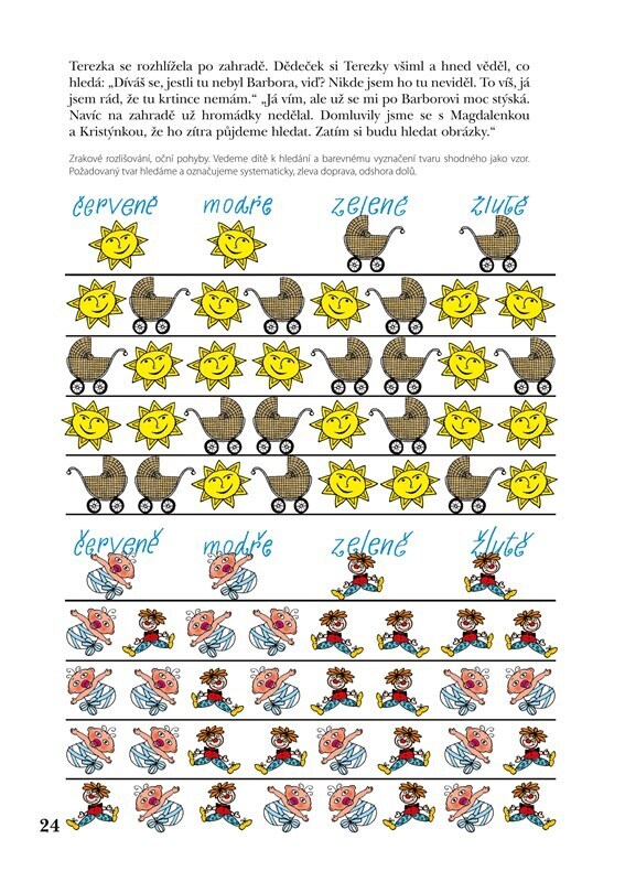Publikace je určena předškolním dětem k rozvoji zrakového vnímání a prevenci potíží ve čtení a psaní plynoucích z nedostatečné zrakové percepce. Knížka se věnuje rozlišení a pojmenování barev, odlišení tvarů prvků. V knize jsou zahrnuta cvičení z oblasti zrakové diferenciace, zrakové analýzy a...