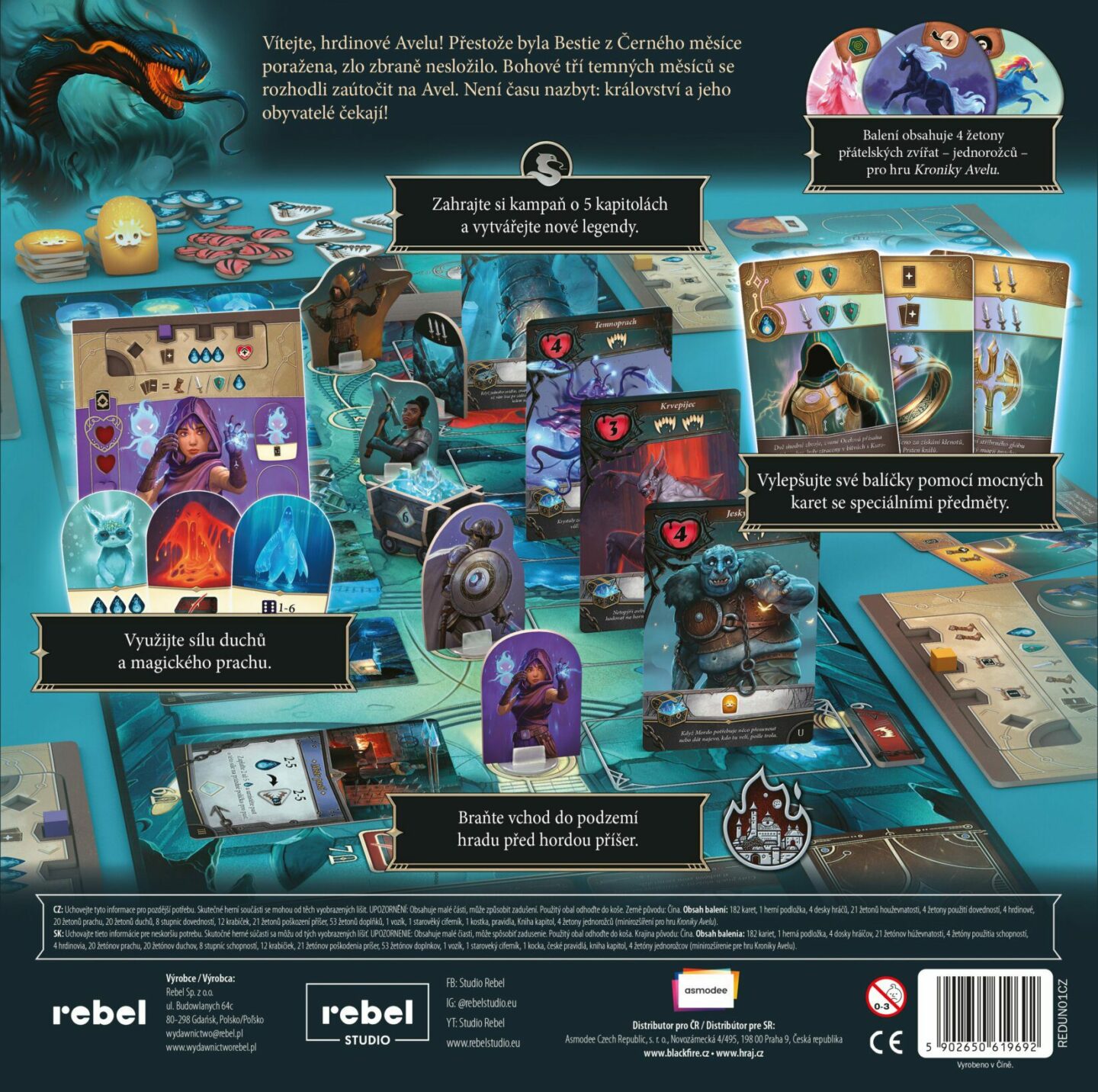podzemí hradu před hordou příšer. Balení obsahuje 4 žetony přátelských zvířat – jednorožců – pro hru Kroniky Avelu. Obsah balení: 182 karet 1 neoprenová herní podložka 4 desky hráčů 21 žetonů houževnatosti 4 žetony použití dovedností 4 hrdinové, 20 žetonů prachu 20