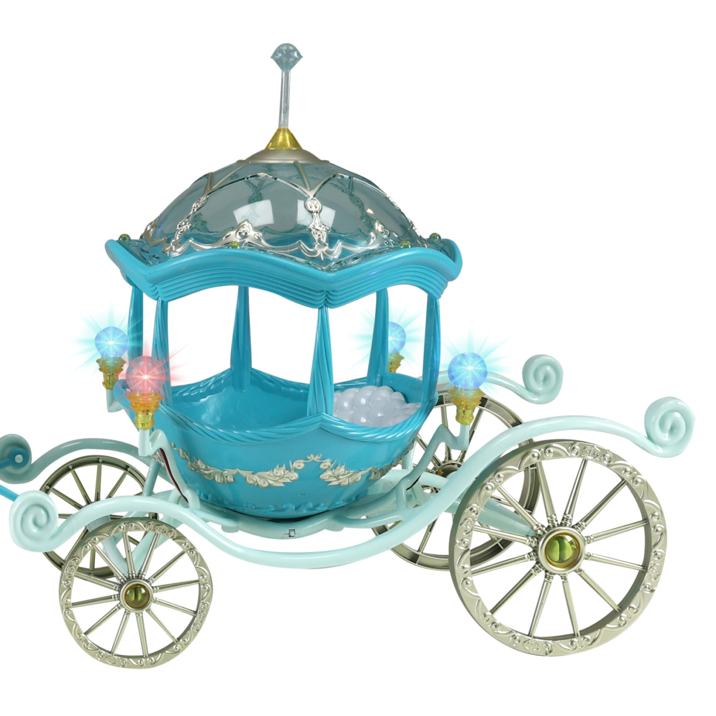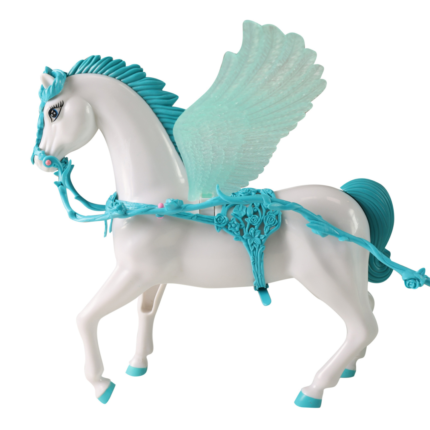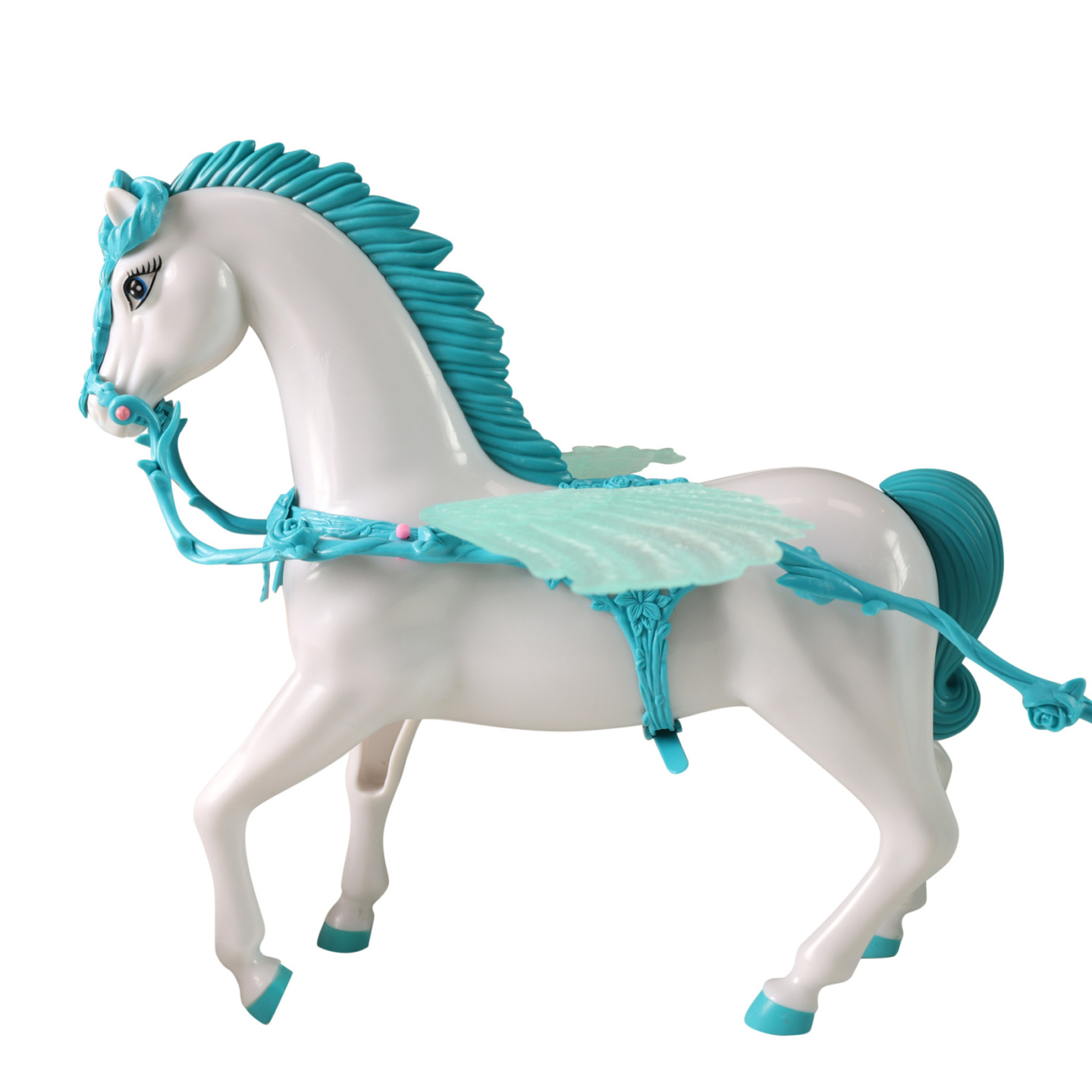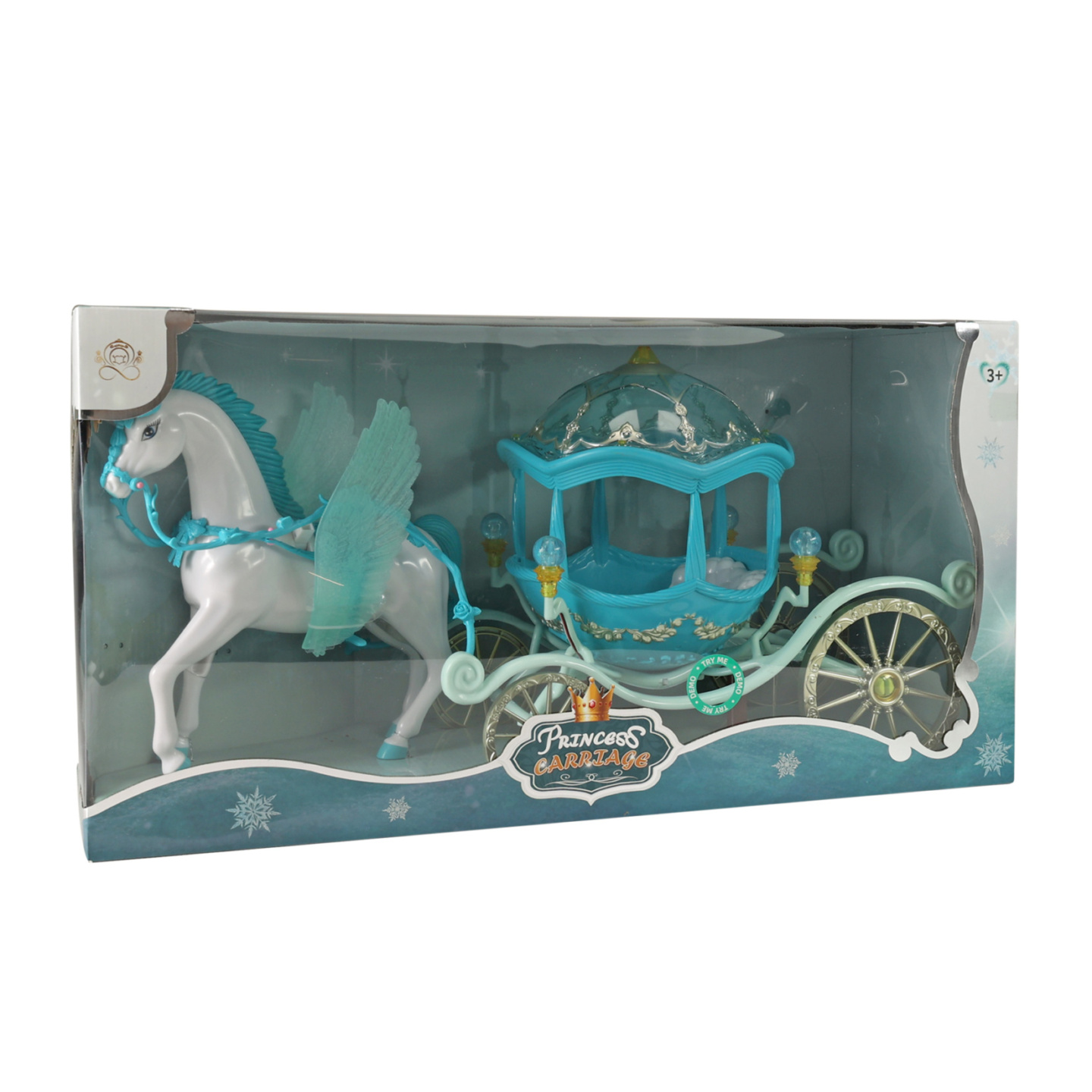 Bílý kůň s křídly zapřáhnutý do pohádkového kočáru. Každá tvá panenka si bude přát vyrazit v něm na zámecký bál! U kočáru po spuštění blikají lampičky. K této funkci je nutné použítí 3x1.5V baterií typu AG13, které jsou součástí .Celková délka kočáru i s koníkem je cca 60...