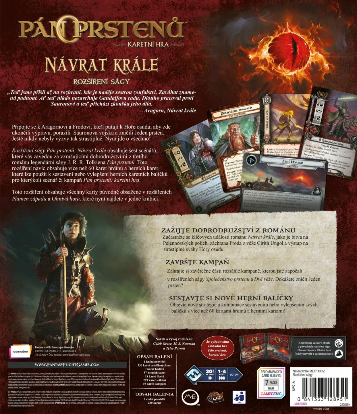 prstenů: karetní hra. Toto rozšíření obsahuje všechny karty původně obsažené v rozšířeních Plamen západu a Ohnivá hora, které nyní najdete v jedné krabici. ZAŽIJTE DOBRODRUŽSTVÍ Z ROMÁNU Zúčastněte se klíčových událostí románu Návrat krále, jako je bitva na