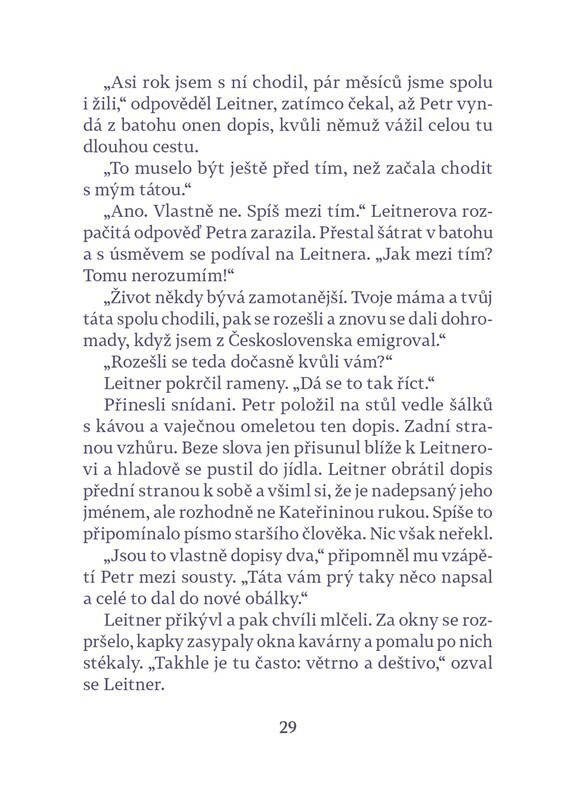 Pavel Leitner žije v nizozemském Leidenu, kam v roce 1970 emigroval z Československa. Patří mu antikvariát, společnost mu po rozpadu dlouholetého manželství dělá jen kocour. Jednoho dne jeho poklidný život naruší telefonát ze staré vlasti. Jakýsi mladík jménem Petr má pro něj dopis, který mu na...