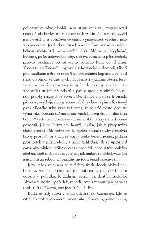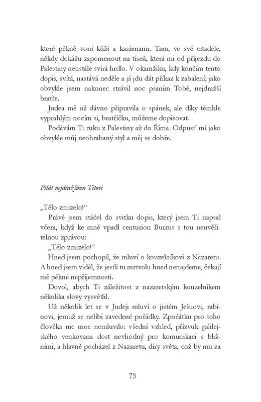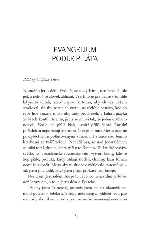 Román se skládá ze dvou částí. V první je mluvčím sám Ježíš (v knize Ješua), který koná zázraky, ale stále má pocit, že sám své kroky neřídí. V druhé části popisuje Pilát Pontský v dopisech svému bratrovi do Říma jakéhosi Ješuu, který byl špatným truhlářem a špatným Židem, bratříčkoval se s...