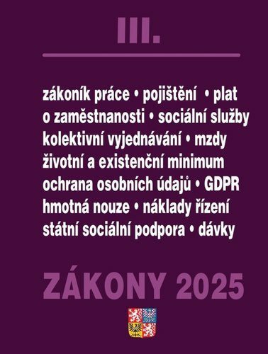 Zákony III obsahují právní předpisy pro oblast zákoníku práce, mzdových a platových předpisů, zaměstnanosti, pojištění, veřejného zdraví. Všechny právní předpisy obsahují novely zákonů schválených během roku 2024 k právnímu stavu 1. 1. 2025.