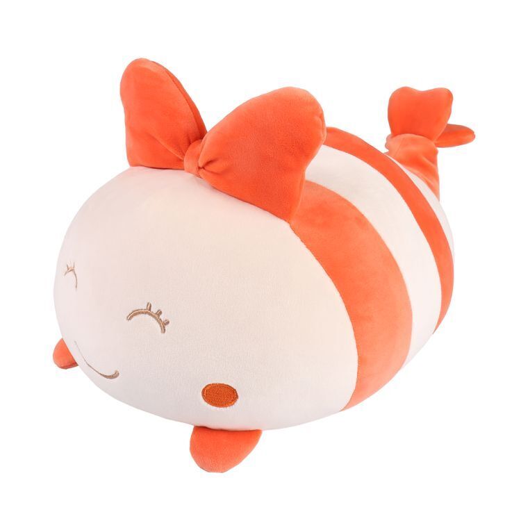 Heboučký polštář ve tvaru krevety s roztomilým obličejem.