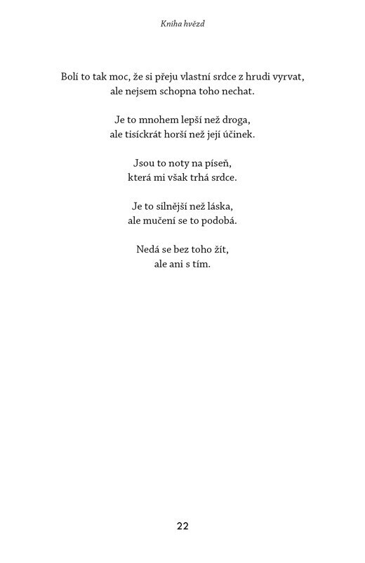 Každý to známe. Známe to, když chceme vykřičet všechno… TO všechno, co máme na srdci, na mysli či už na jazyku. A když začneme křičet, co se stane? A tak začaly padat hvězdy. Jedna po druhé… Ale stála tam dívka s otevřenou knihou. Nikdo neví, jestli to ona křičela. Ale ví se, že je všechny...