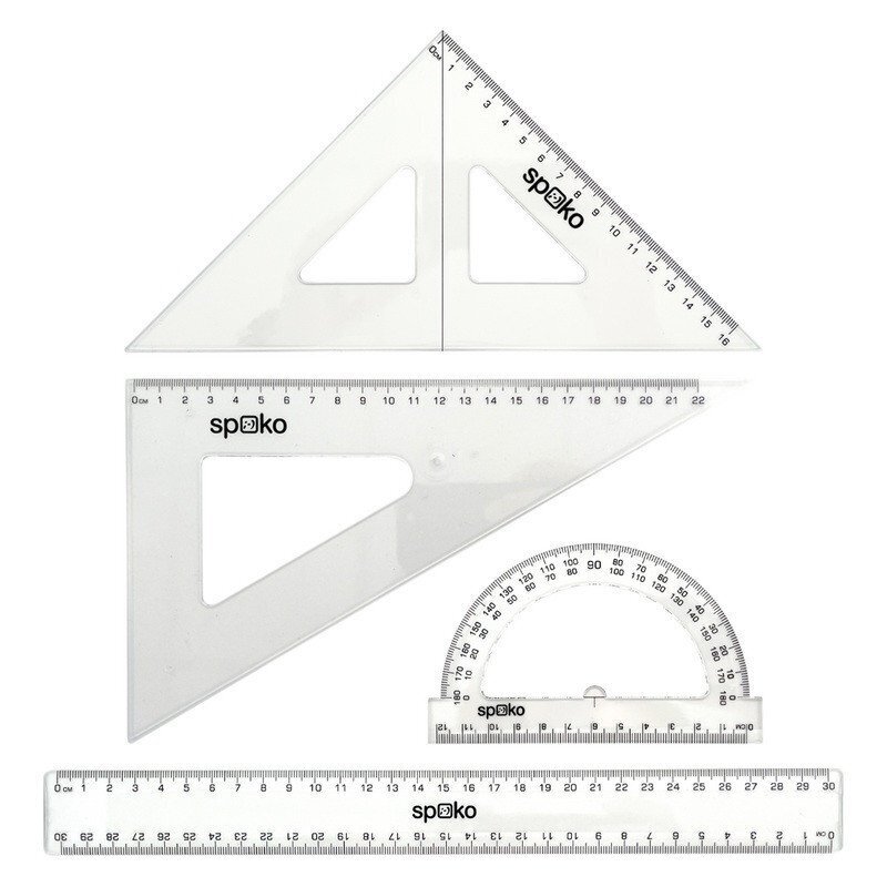 Čtyřdílná sada pravítek, určená pro školní geometrii. Sada obsahuje ploché pravítko, trojúhelník s ryskou, úhloměr, pravoúhlý tr...