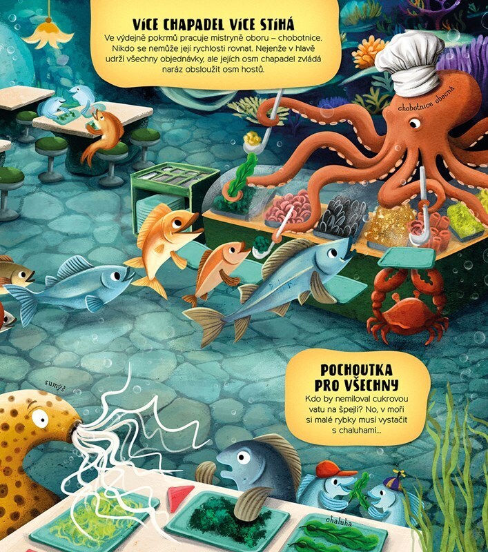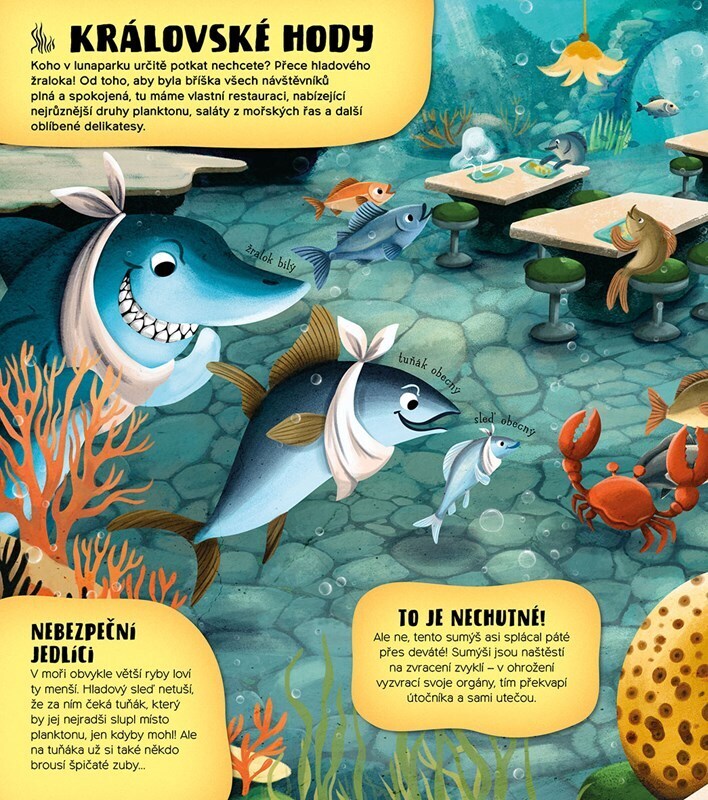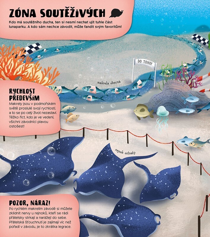 Vítej v podmořském lunaparku! Sépie ti u vstupu natiskne inkoustové razítko, a už můžeš dál. Ale kam dřív? Na hřišti v korálovém útesu dovádějí želvy, sardinky se tísní v kabinkách vyhlídkového kola, mořský ďas je hlavním lákadlem strašidelného vraku, a pokud se unavíš, popoveze tě dobrácký...