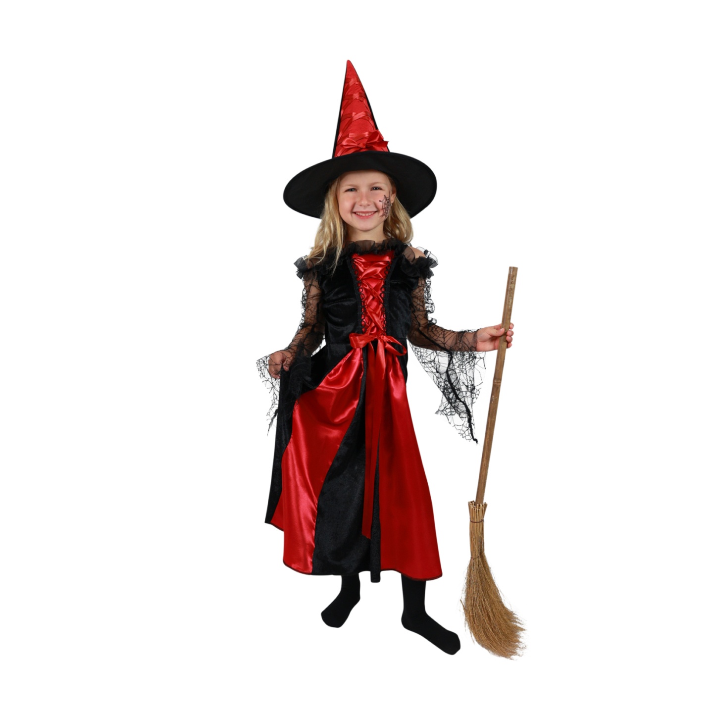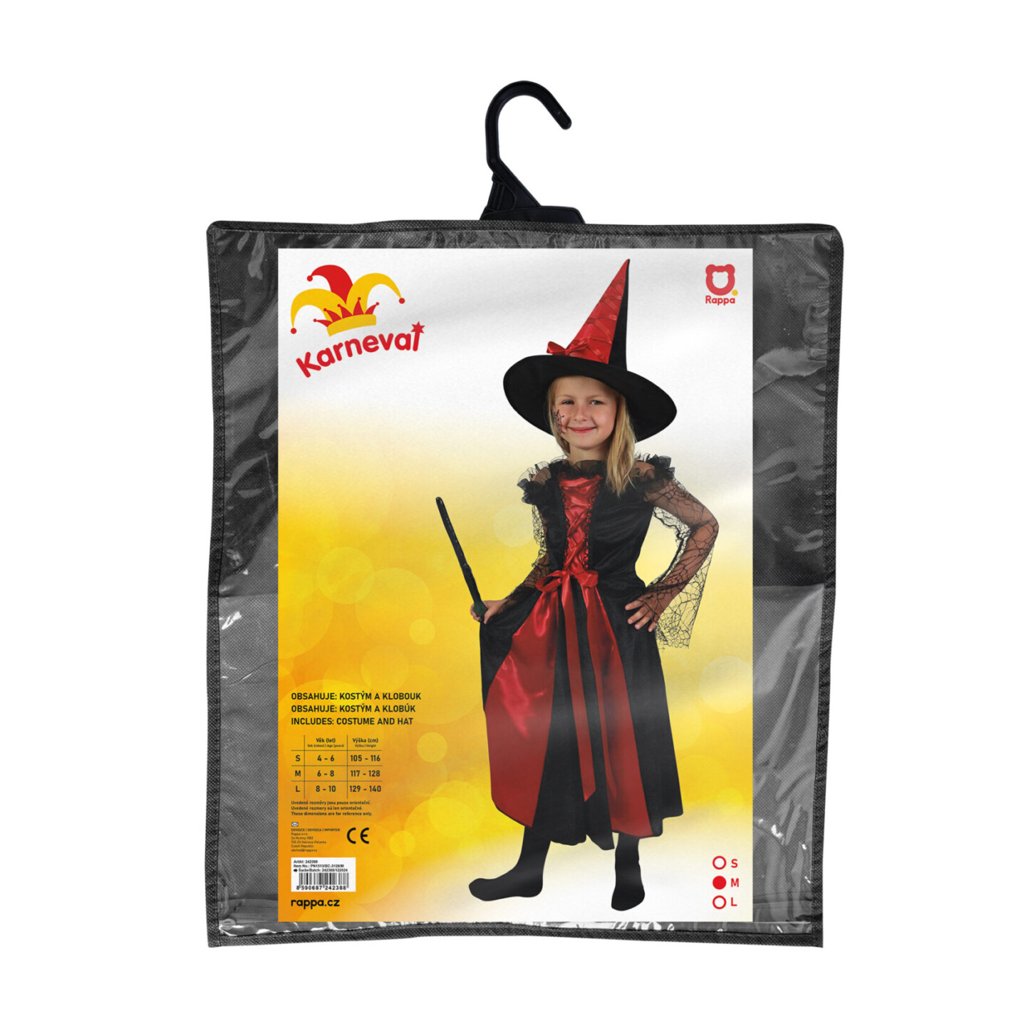 Roztomilý karnevalový kostým černo-červené barvy udělá radost každé holčičce! Souprava obsahuje šaty s pavučinkovými rukávy a klobouk s mašlí. Set ve velikosti M je určen pro holčičky ve věkovém rozmezí 6-8 let (117-128 cm). Vhodný i na oslavu Halloweenu! Koště ani hůlka nejsou součástí...