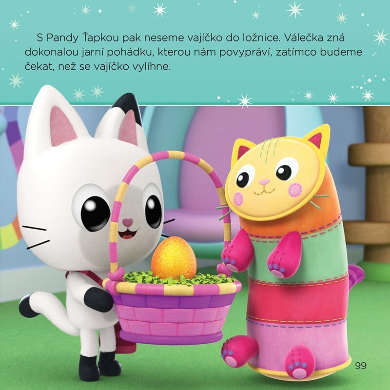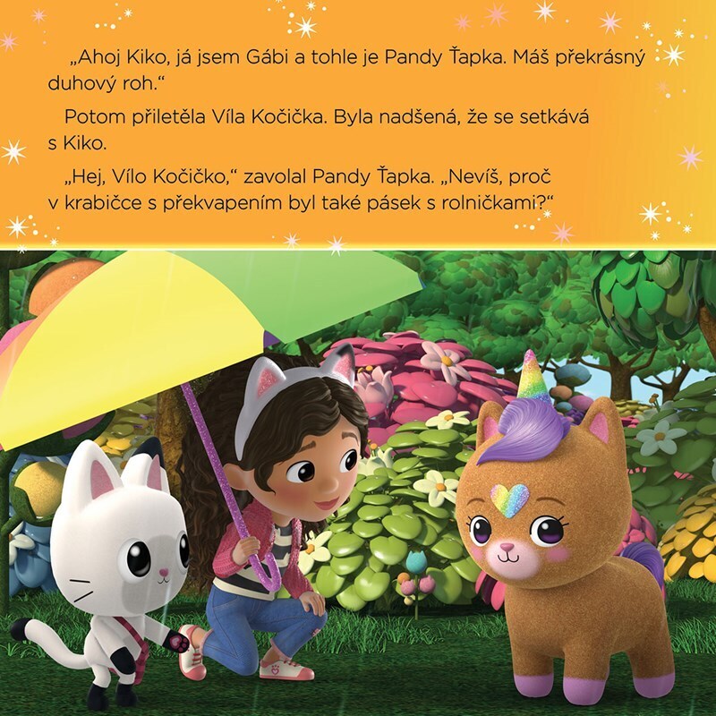 Máte v ruce kočkózní novou knížku se čtyřmi pohádkami! Když Gábi v krabičce s překvapením objeví třpytivé semínko, obrátí se na Vílu Kočičku, aby jí pomohla svou zahradní magií. Jednoho deštivého dne se v Kouzelném domku objeví malé kočkorožčí mládě! Jaké zábavné věci spolu kamarádi zažijí?...
