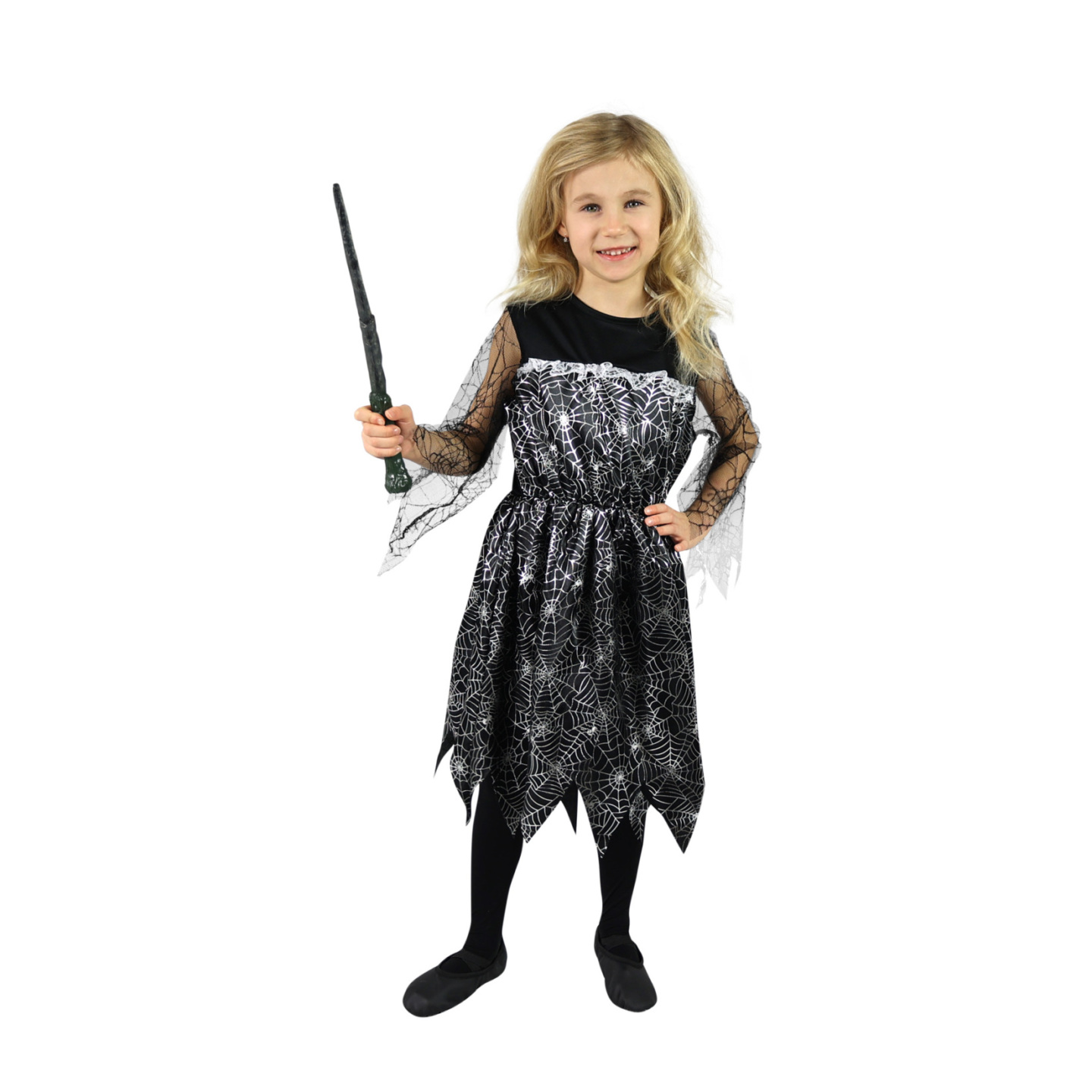 Magický karnevalový kostým pro malé čarodějnice! Kostým ve velikosti M je určen pro holčičky ve věkovém rozmezí 6-8 let (117-128 cm). Černé šaty jsou dekorovány stříbrnou pavučinkou. S tímto úchvatným kostýmem se zaručeně staneš hvězdou karnevalu i Halloweenu! Koště ani hůlka nejsou součástí...