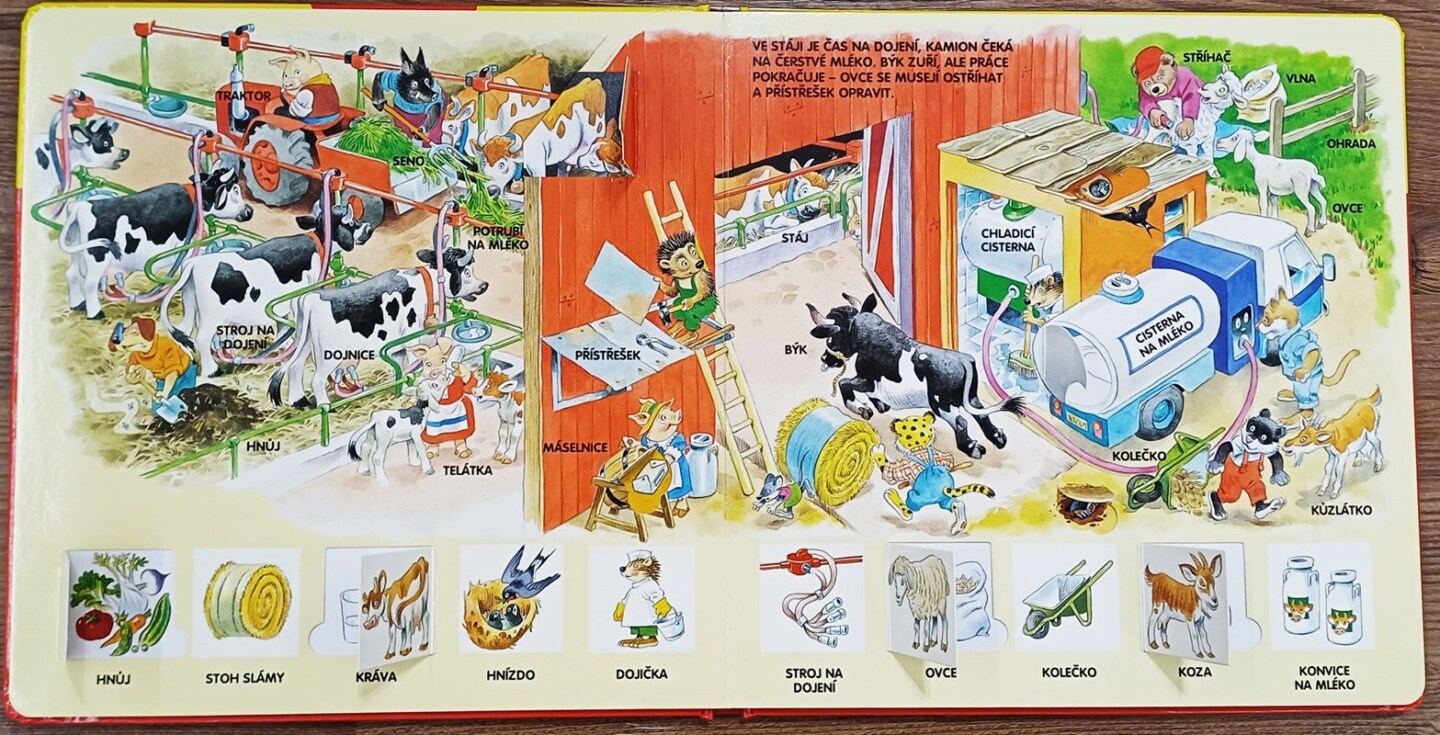 Kdo spí ve chlévě? Jak transportovat koníky? Odkud pochází med? Kde je schované zrno? Kdo podkouvá koníky? Jak se dělá máslo? Pootevírejte okénka a objevujte svět milých obyvatel farmy: Těch, kteří dojí kravičky, vozí se na hříbětkách, sejí pšenici a ty, kteří sbírají ovoce. Všichni usilovně...