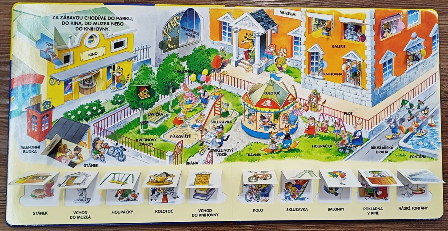 Projděme se spolu po ulicích a náměstích města, objevujme jeho veselé obyvatele a jejich řemesla. Otevřete více než 100 okének a naučte se vše, co se děje na ulici, na nádraží, v továrně, na letišti, ve velkých hotelech a v supermarketu. Všichni pracují ve městě a někomu se občas stane i něco...