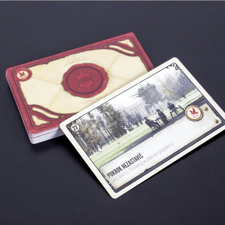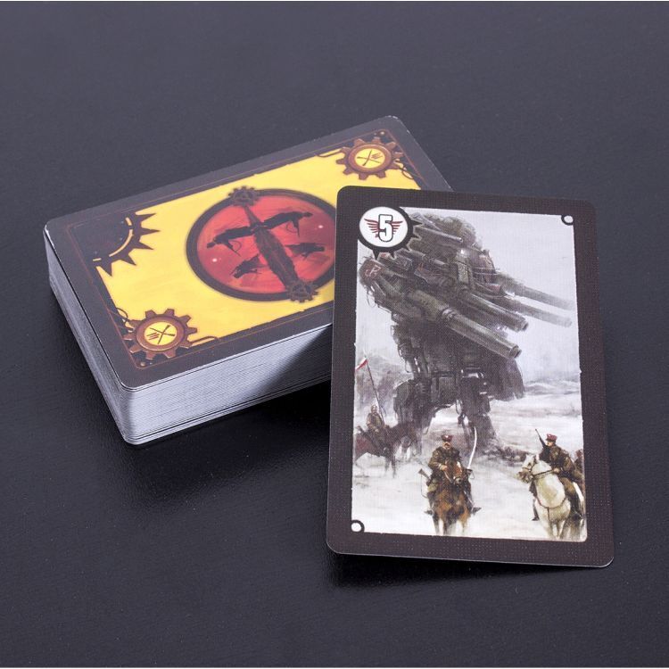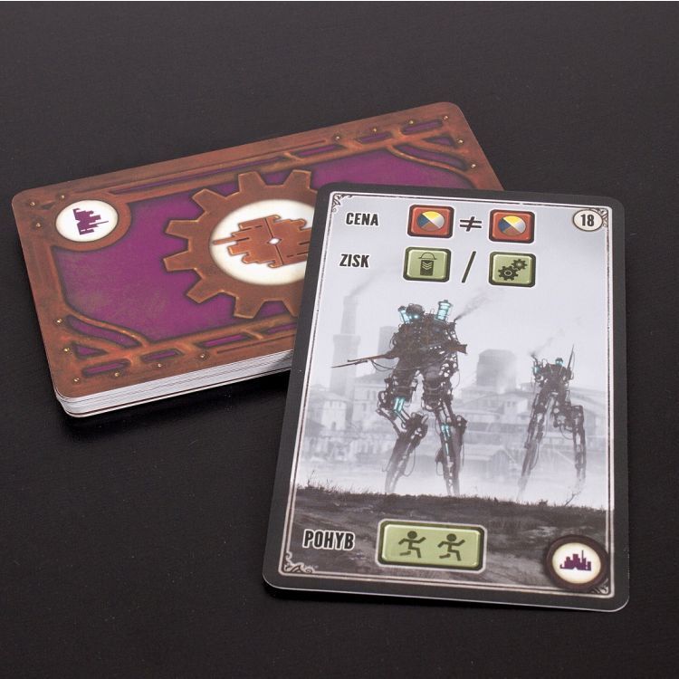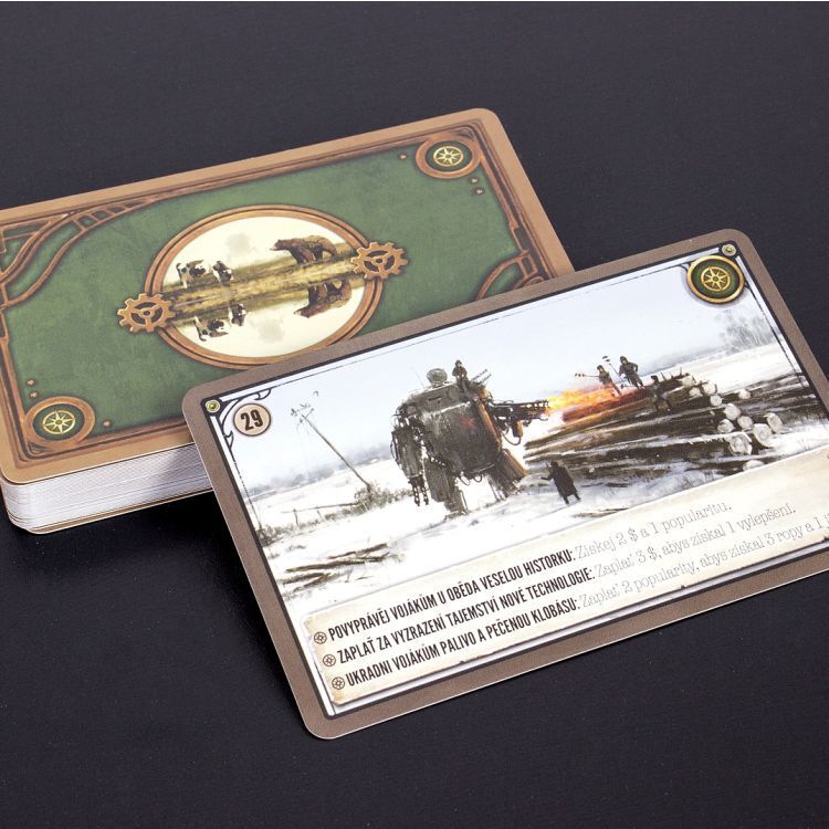 hráče, 23 karet úkolů, 28 karet Setkání, 42 bojových karet, 12 karet Továrny, 5 karet nápovědy k Brodění, 5 kartiček rychlé nápovědy, 80 žetonů surovin (20 od každého typu: jídlo, kov, dřevo a ropa), 80 mincí (různé hodnoty), 2 bojové ukazatele, 12 násobících žetonů,