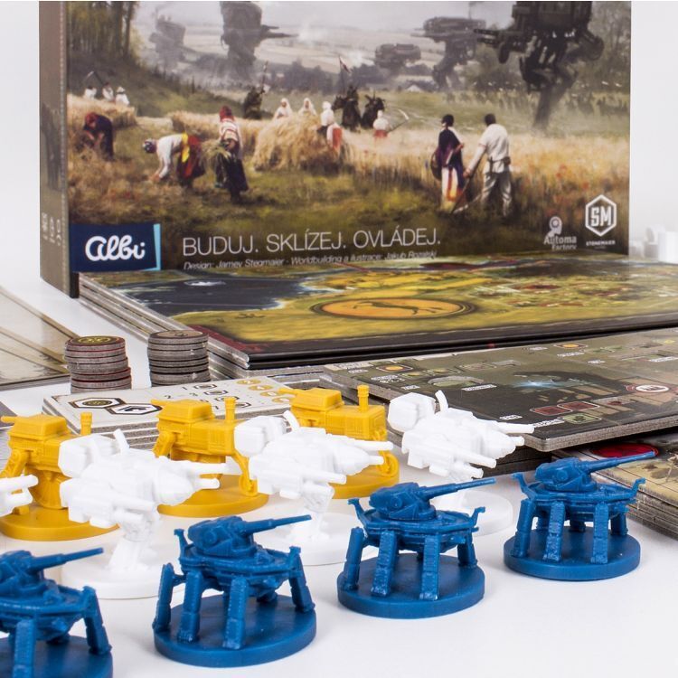 12 žetonů setkání, 6 dílků stavebních bonusů, komponenty frakce - 5 desek frakce, 5 figurek akce, 5 žetonů popularity, 5 žetonů moci, 30 žetonů hvězd, 20 dřevených budov, 20 figurek rekrutů, 20 miniatur mechů, 5 miniatur postav, 40 figurek dělníků, 30 kostek technologií, list