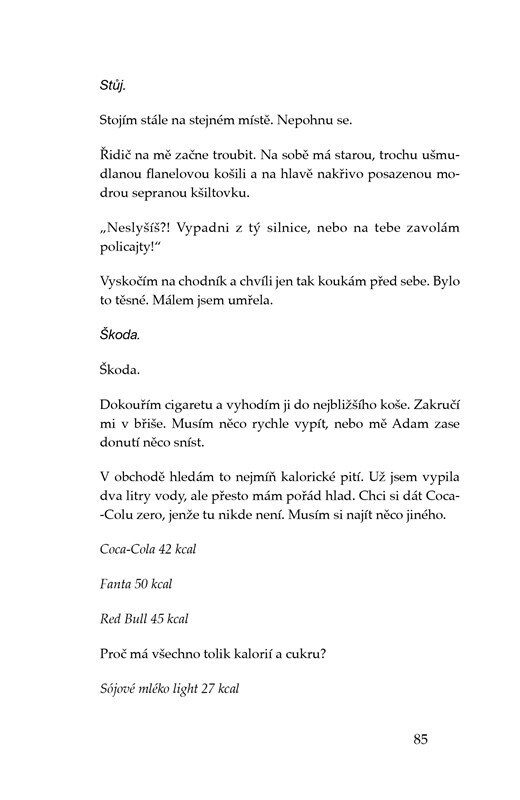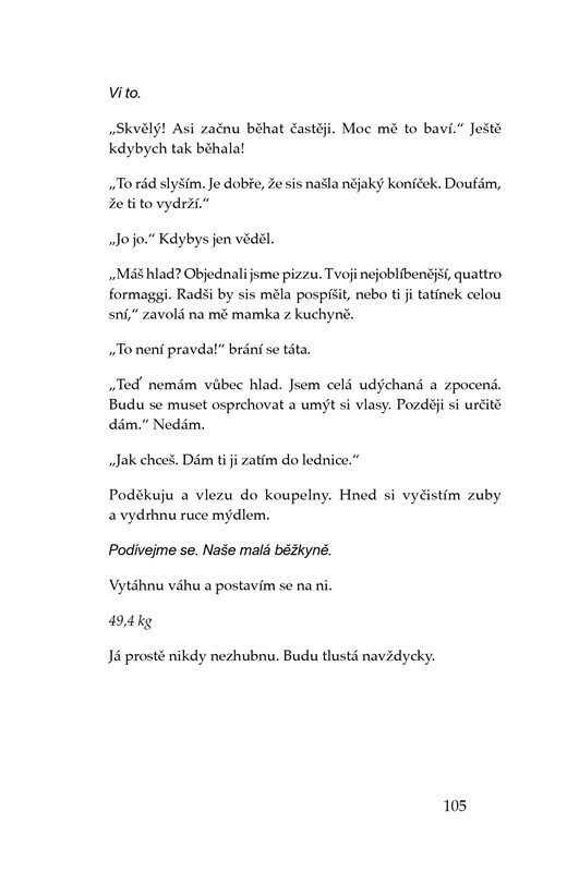 Anna má skvělé rodiče, koníčky, spoustu přátel, první lásku. Jenže její idylku naruší Ana. Není to nová kamarádka, ale anorexie, která ji postupně proměňuje v hromádku neštěstí. Její život ovládne jídlo a počítání kalorií. Ana s sebou navíc přináší bulimii, deprese, lži a izolaci od okolí. Kniha...
