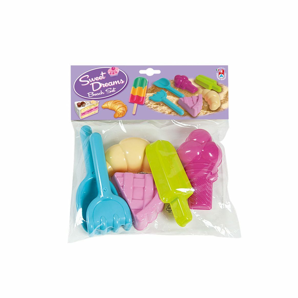 6dílná sada tvořítek na písek - cukrárna. Vyrobeno v Itálii z kvalitních plastů. Obsahuje: Hrabičky, lopatku a tvořítka: nanuk, zmrzlina, dortík a croissant. Baleno v sáčku o rozměrech 23 x 31 cm. Váha: 0,17 kg. Doporučený věk od 10 měsíců.