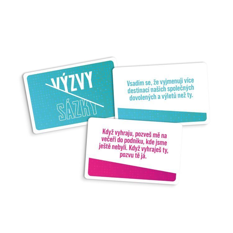 Poměřte s partnerem své síly, dovednosti, znalosti či odvahu. Troufnete si přijmout danou výzvu? Co asi bude v sázce? Hra Výzvy a sázky - Pro páry obsahuje: 45 karet výzev, 45 karet sázek, 8 prázdných karet pro vlastní výzvy a sázky, pravidla.