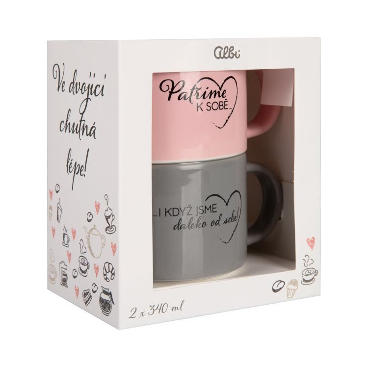 Dvojice hrnků pro vás dva! Díky dárkovému balení se z hrnků stává perfektní drobnost. Materiál: keramika Objem: 2 x 340 ml