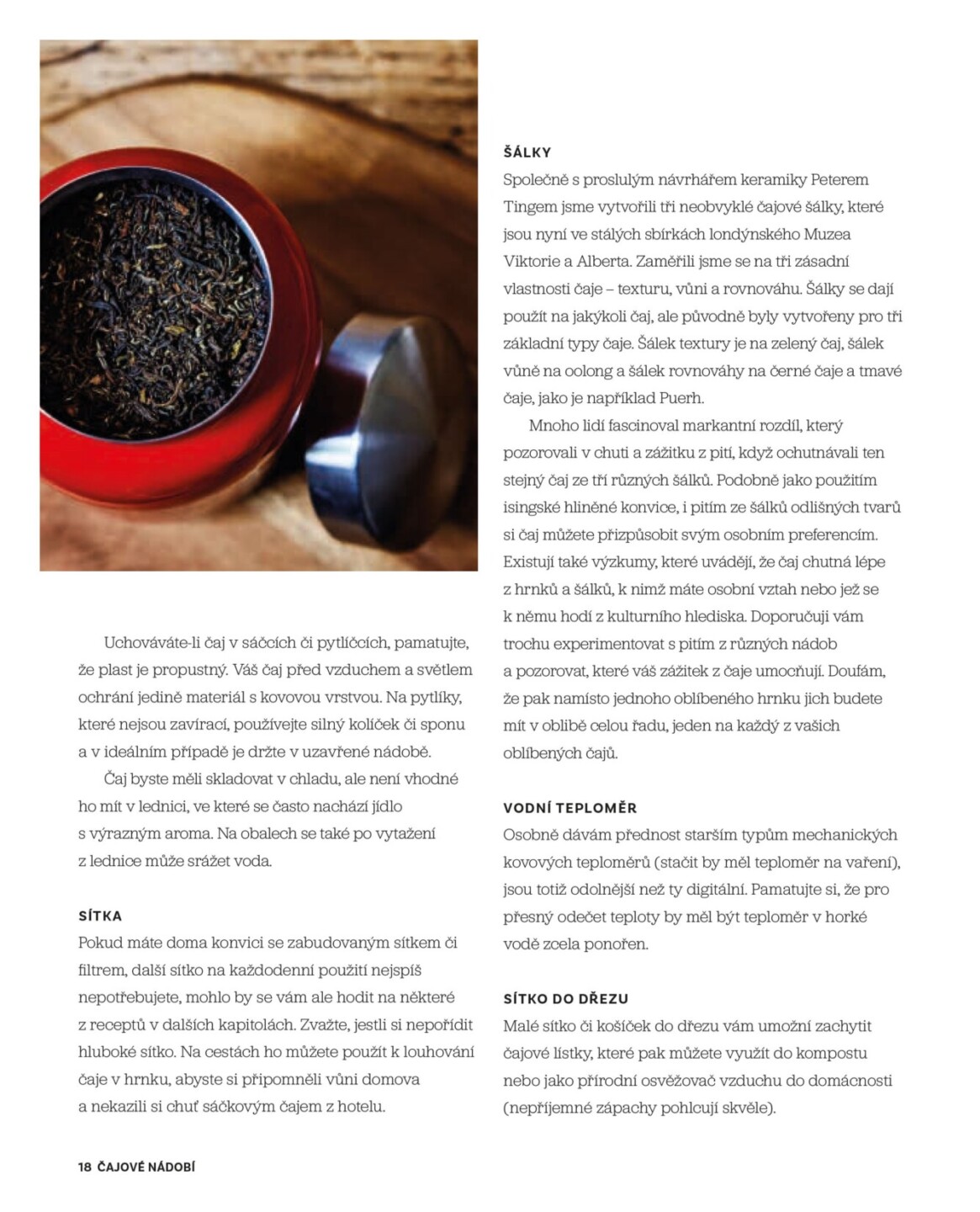 Moře zelené pěny ve velkém černém hrnku, zvuk lžičky cinkající o okraj porcelánového šálku s květinovým vzorem, hrneček tenký jako papír, který skrývá omamně vonící elixír, chuť jílu a sladkých koření z terakotové misky tak horké, že se skoro nedá udržet. Tyto příklady z Japonska, Anglie a Číny...
