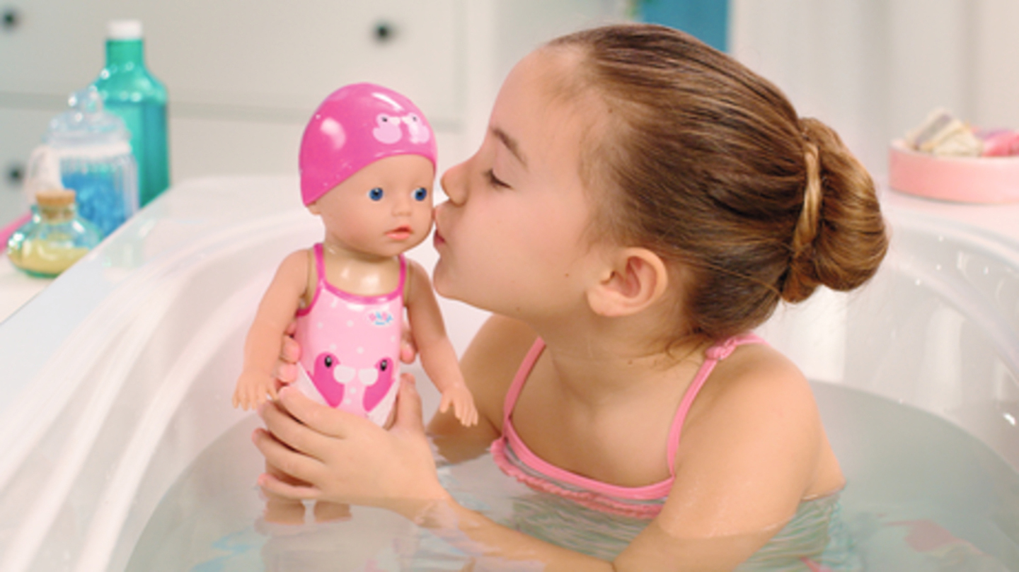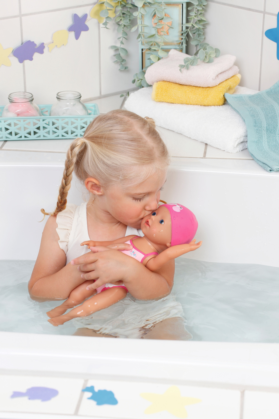 Malá holčička už se toho na hodině plavání tolik naučila. Nejraději má kraul a motýlka. Když plave kraul, střídá ve vodě jednu ruku za druhou, u motýlka rukama hýbe nastejno. A vše bez baterií! Stačí panence natáhnout ruce dozadu a je připravena na další kolo. Když jí ruce uvolníš, začne ve vodě...