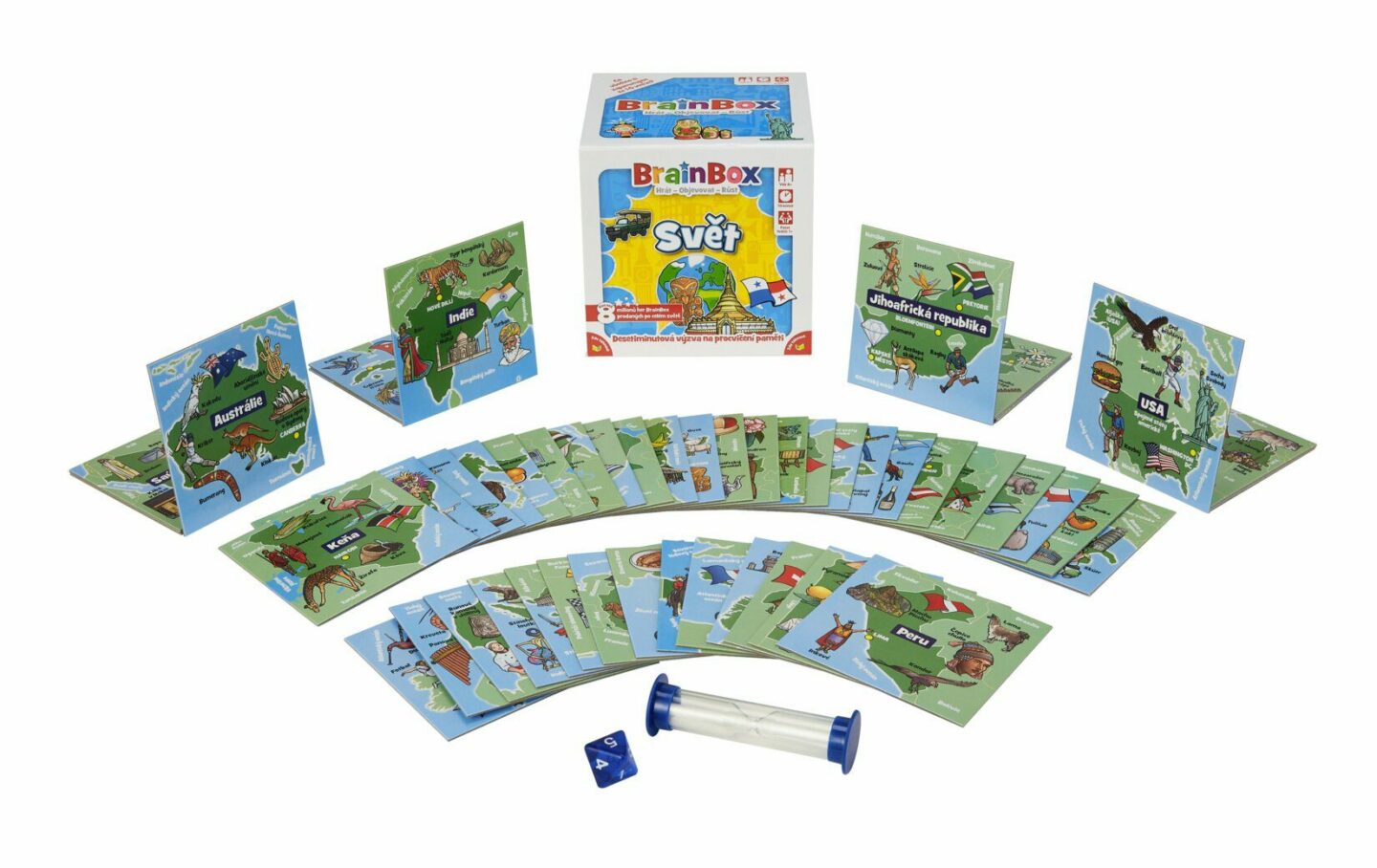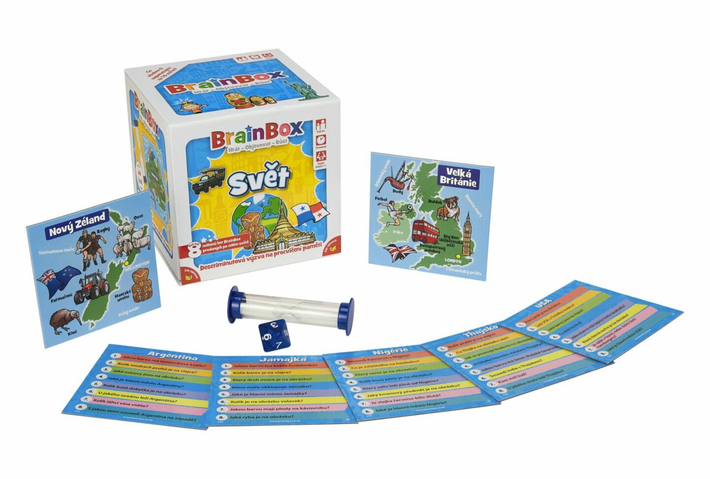 zemí celého světa - jak dobře znáte obyvatele, kulturu, a to nezajímavější a nejtypičtější pro dané země? BrainBox Svět obsahuje 55 hracích karet s nejrůznějšími zeměmi: od Velké Británie po USA, od Řecka po Ghanu, od Thajska po Mexiko a tak dále. Na každé kartě je mapa
