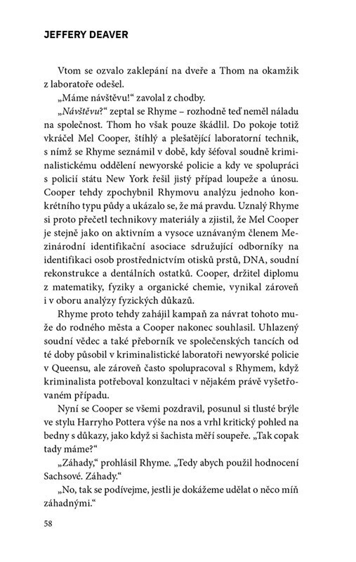 Když se prestižní hudební školou rozlehne výkřik a výstřel, policie rychle vtrhne do zamčené učebny, v níž se skrývá vrah. Jenže místnost je prázdná. Rhyme a Sachsová se pouští do vyšetřování, ale proti nim stojí mistrný iluzionista přezdívaný Kejklíř. Pohrává si s nimi a burcuje jejich...