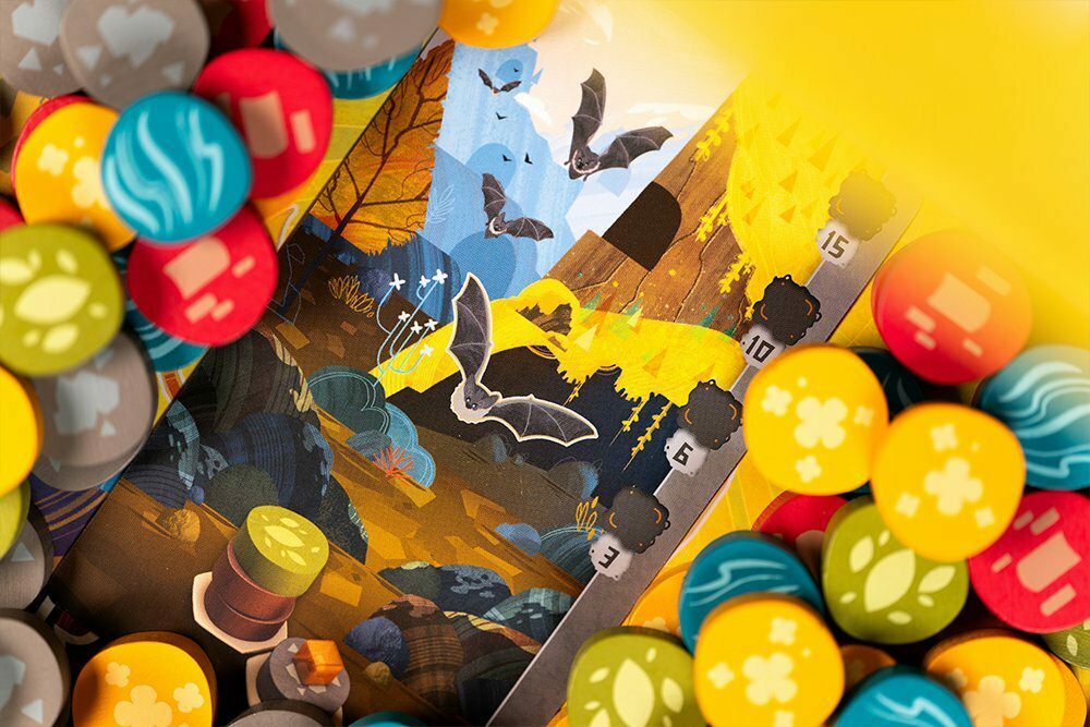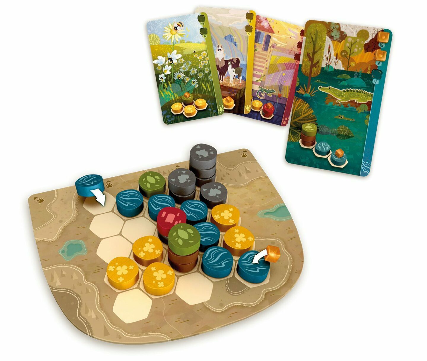 KRAJINA ZVÍŘAT budete pomocí barevných žetonů vytvářet krajinu a biotopy pro svá zvířata. Abyste získali co nejvíce bodů a vyhráli hru, moudře zakomponujte biotopy do svých krajin a zabydlete v nich co nejvíce zvířat. 1) Umisťujte žetony krajinných prvků a na své desce