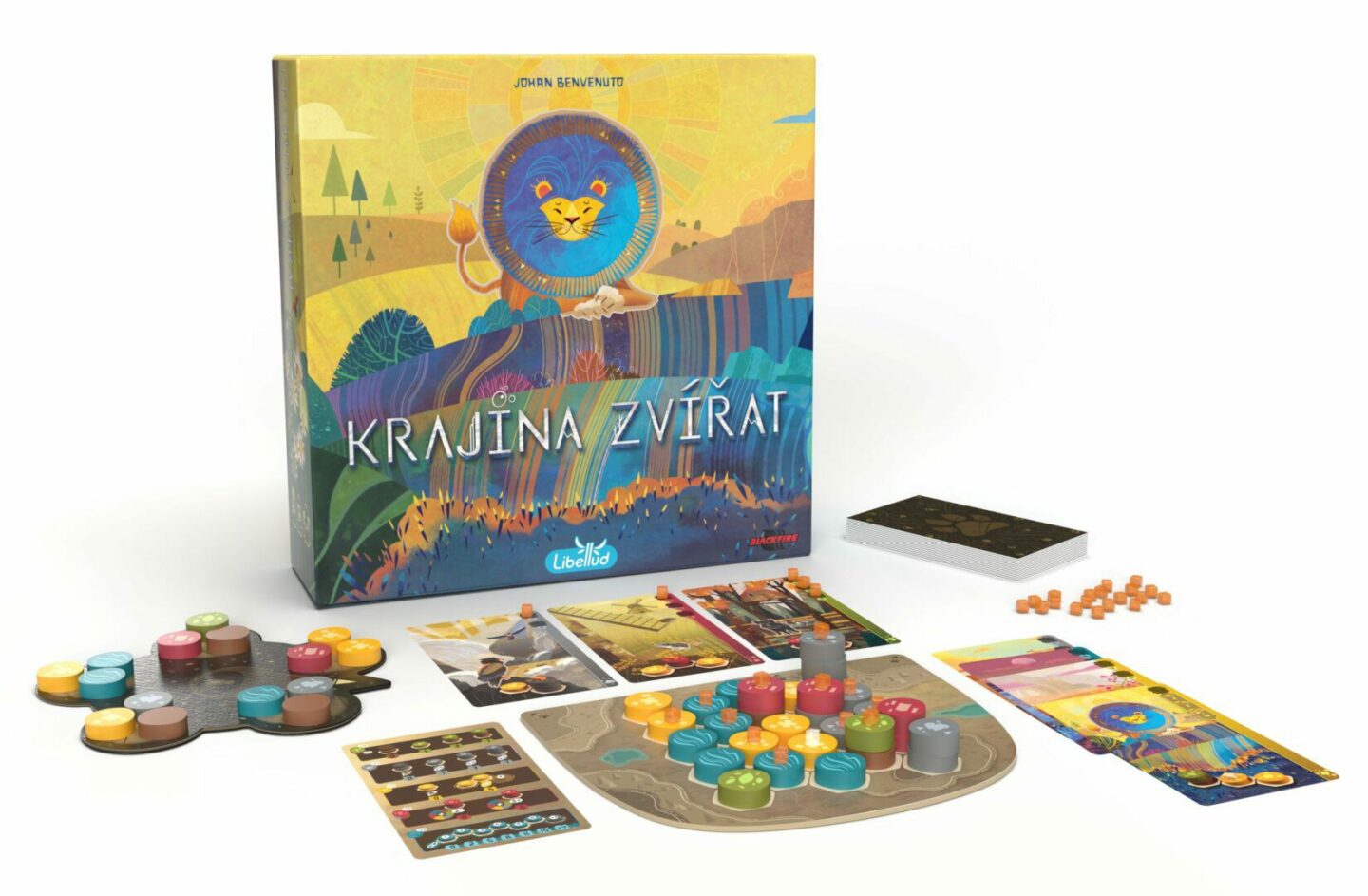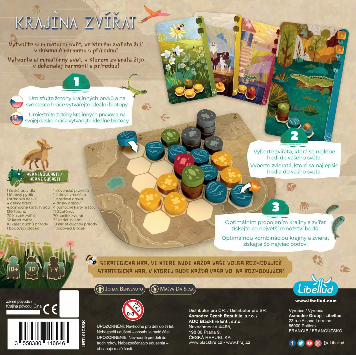 hráče vytvářejte ideální biotopy. 2) Vyberte zvířata, která se nejlépe hodí do vašeho světa. 3) Optimálním propojením krajiny a zvířat získejte co největší množství bodů! Obsah balení: 1 látkový pytlík 1 středová deska 4 desky hráčů 4 pomocné karty hráčů 120