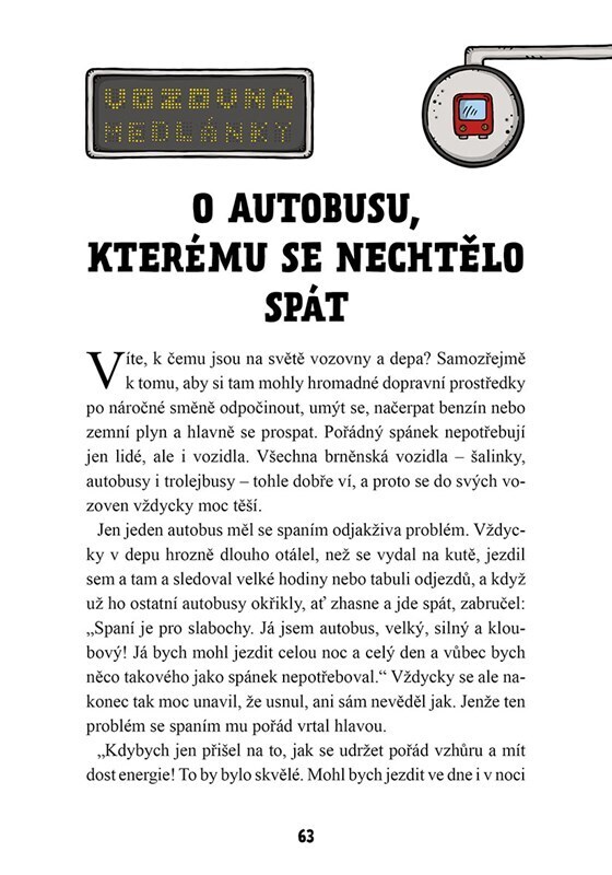 Chceš zjistit, o čem si povídají šalinky, trolejbusy a autobusy, když se večer vrátí do vozovny? Vstup do kouzelného světa brněnské MHD, kde se odehrávají hravé a veselé pohádky plné nečekaných dobrodružství. Poznáš šalinku, která se bála tmy, trolejbus, co chtěl závodit, nebo třeba i vzteklý...