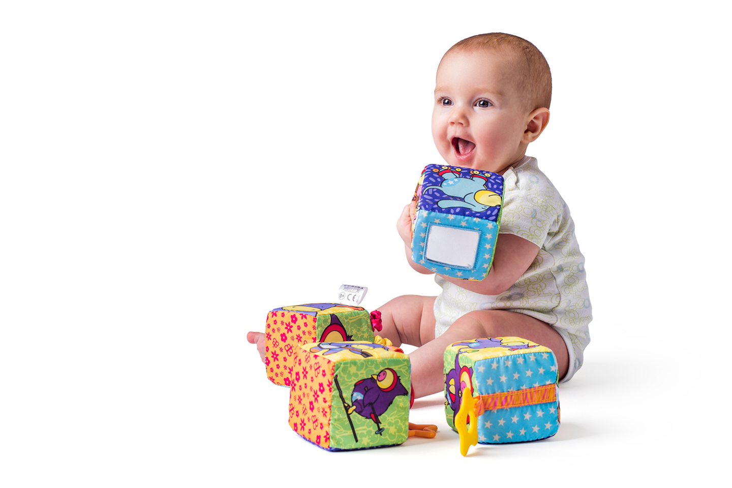 Všechny látkové kostky obsahují různé hrací komponenty: chrastítka, kousátka, pískátka, zrcátko vyrobené z bezpečnostní fólie ve kterém může dítě pozorovat svůj obličej a části vydávající zvuky mačkaného papíru. Všechny tyto komponenty stimulují dětské smysly i jemnou motoriku. Věk: 0+ | Rozměr...