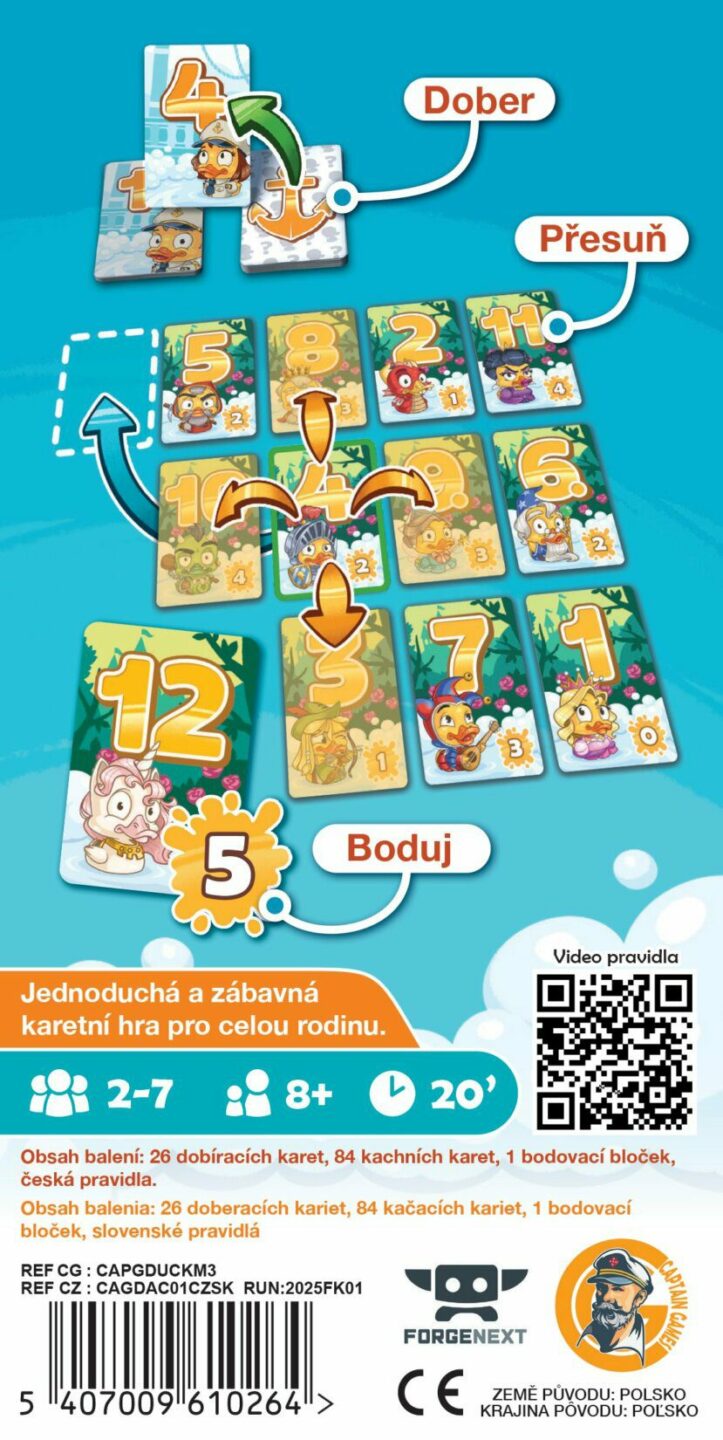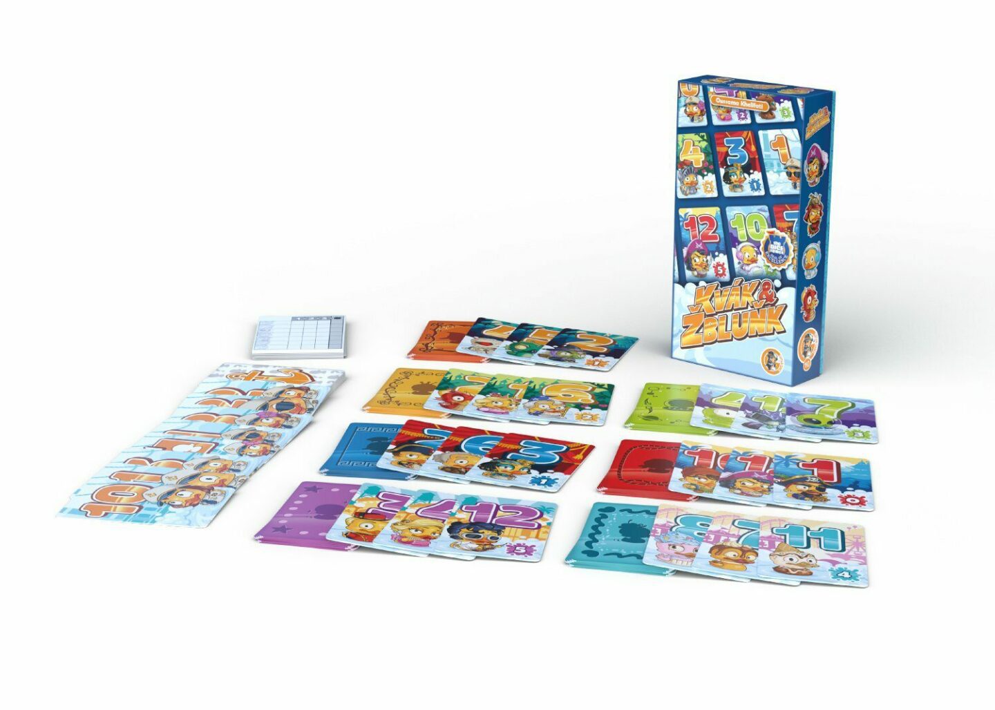 Karetní hra, která vás přinutí kvákat! Jejda! Vaše gumové kachničky cákají vodu z vany! Zabraňte jim v zatopení celé koupelny! Váš cíl ve hře Kvák & žbluňk je nasbírat co nejméně bodů během 3 kol. Každý hráč si vybere 1 ze 7 kachních rodin, zamíchá 12 karet a náhodně je vyloží do mřížky 4x3....