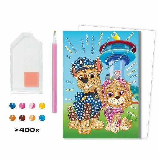 Kreativní set diamantové malování s motivem Paw Patrol/Tlapková patrola obsahuje přes 400 kamínků, obrázek k nalepení diamantů, pero k nabírání jednotlivých diamantů a obálku, do které můžeme hotový obrázek zabalit. Velké kameny/diamanty. 18x12,5 cm
