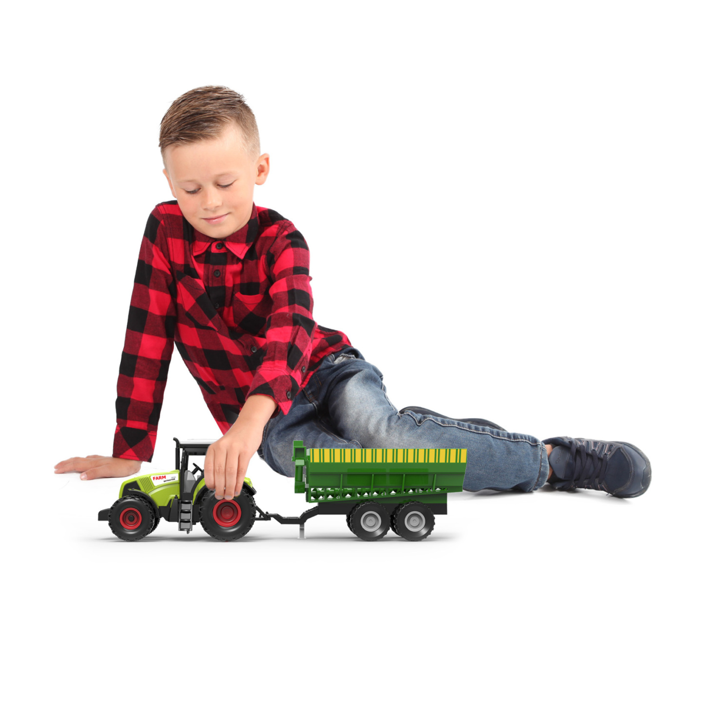 Moderní plastový traktor s vlečkou, hračka z kolekce Moje malá farma. Nepostradatelný pomocník pro každého malého farmáře! Vlečku můžeš jednoduše odpojit a traktor využít k dalším pracím. Traktor jezdí na setrvačník a jeho délka včetně přívěsu je 37 cm. Zmáčknutím tlačítek traktor vydává reálné...