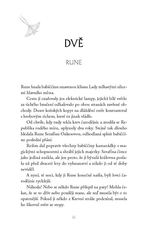 Mladá čarodějnice Rune před světem předstírá, že je jen povrchní dívka s obrovským majetkem – po nocích však jako Karmínová můra zachraňuje jiné čarodějnice před očistou. Aby získala tajné informace, začne se dvořit Gideonu Sharpeovi, známému a nelítostnému lovci čarodějnic s hlavou plnou...