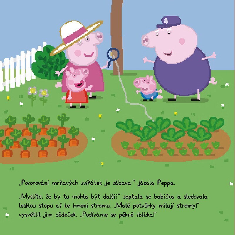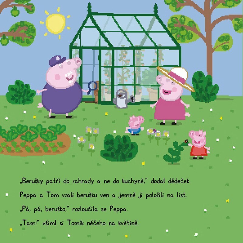 Peppa s Tomem právě obědvali, když v jídle objevili malinkou berušku. Odnesli ji do zahrady, kde si všimli spousty dalších mrňavých zvířátek. Otevřete knížku a ona na vás taky vykouknou!