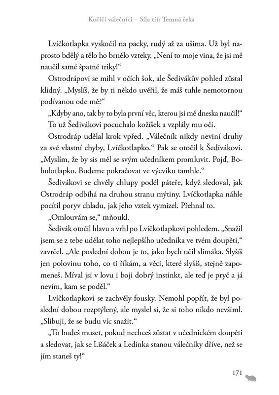 Lvíčkotlapka poruší válečnický zákoník a vydá se do tajemných podzemních tunelů, které vedou dál, než si kdy dovedl představit. Přestože kvůli nočním výpravám zprvu zanedbává své povinnosti, nakonec se mu během výcviku začne dařit. To platí i pro Sojkotlapku a Cesmíntlapku, kteří také rozvíjejí...