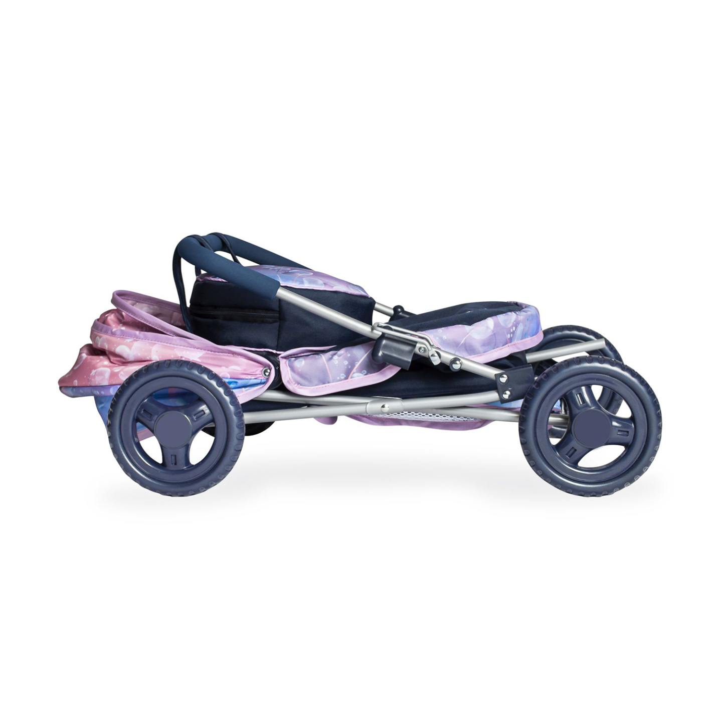 plynule přechází ve světle fialovomodrou, aby v závěru končila královskou modří. Hravé bublinky provázejí celou kolekci. Kulatá závěsná taška na kočárek, jak tvarem, tak designem, podporuje název celé kolekce Magic Bubble. Aplikace tematického Magic Bubble loga výrazně
