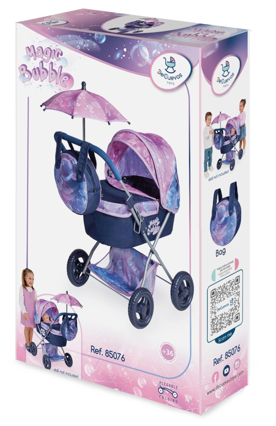 návodem na sestavení • Doporučený věk od 3 letDeCuevas 85076 Skládací kočárek pro panenky se slunečníkem a taškou Magic Bubble 2024 - 60 cm, ze stejnojmenné kolekce, která je novinkou roku 202