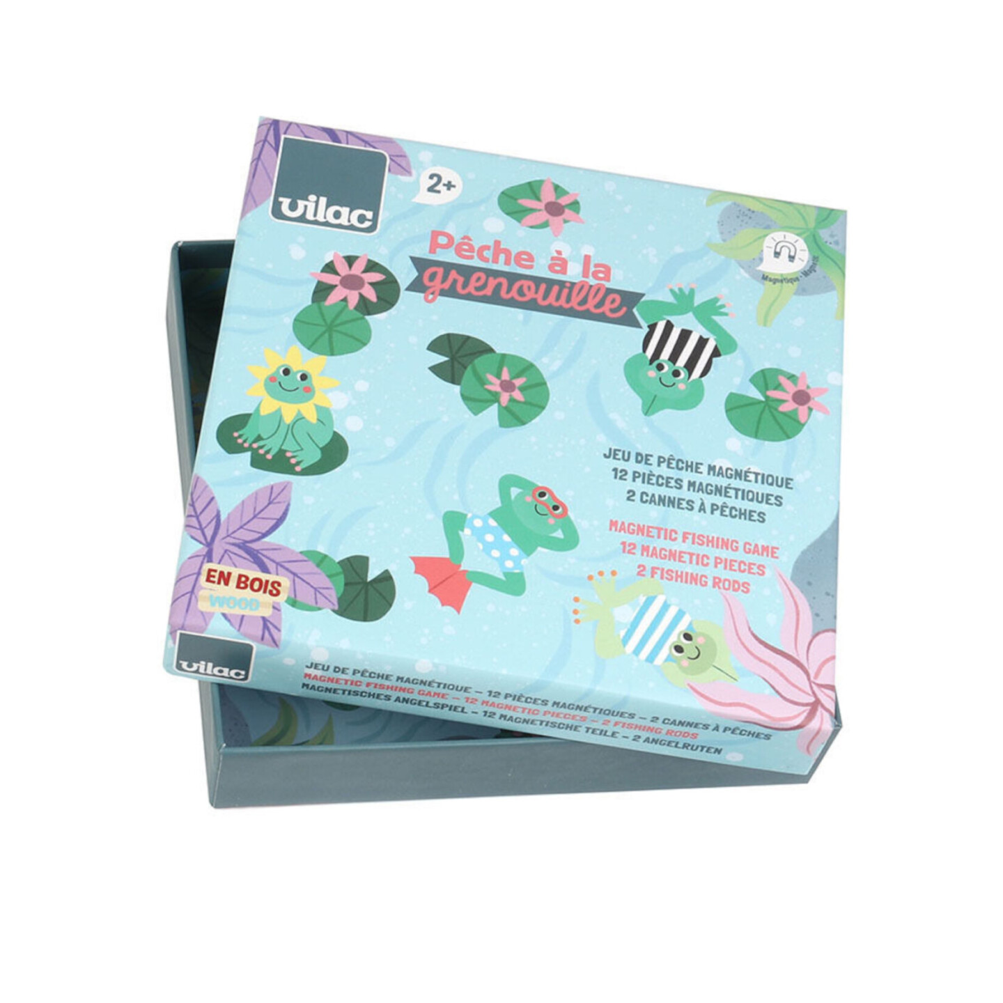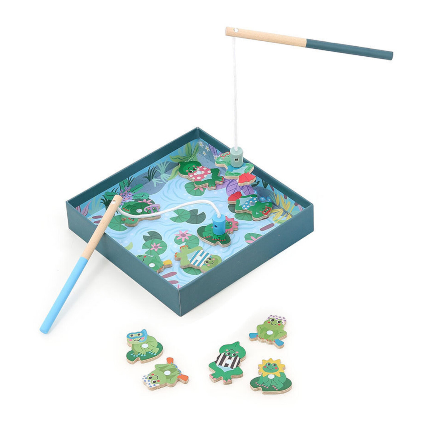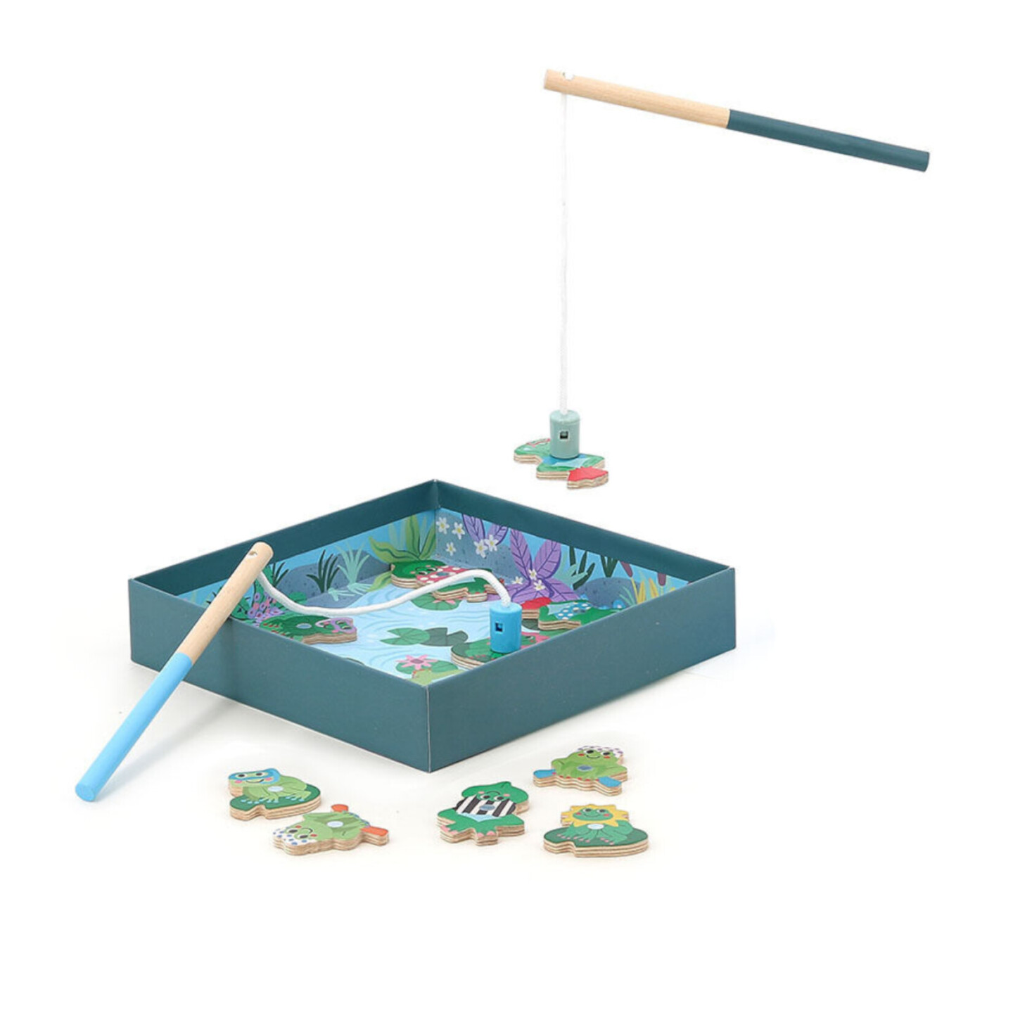 Podporuje také smyslové a vzdělávací učení. Žabky jsou uloženy v krabičce, která se otevřením přemění na herní základnu. Hra obsahuje: 12 dřevěných magnetických žab, 2 dřevěné pruty s magnetem a 1 herní krabičku/základnu Hlavní vlastnosti:•klasická hra v inovativním