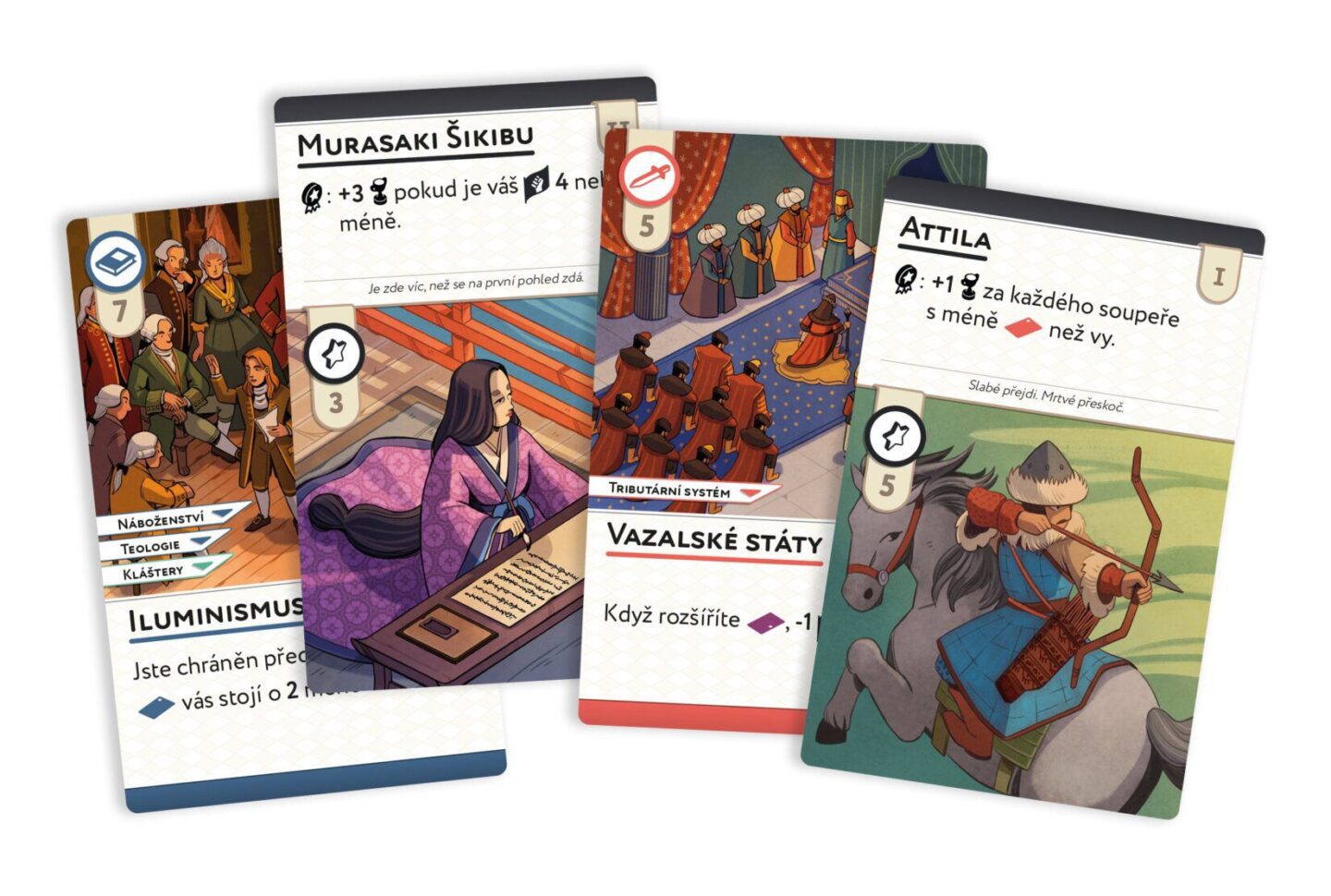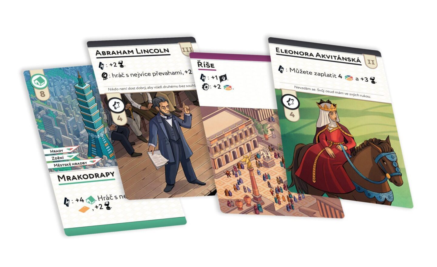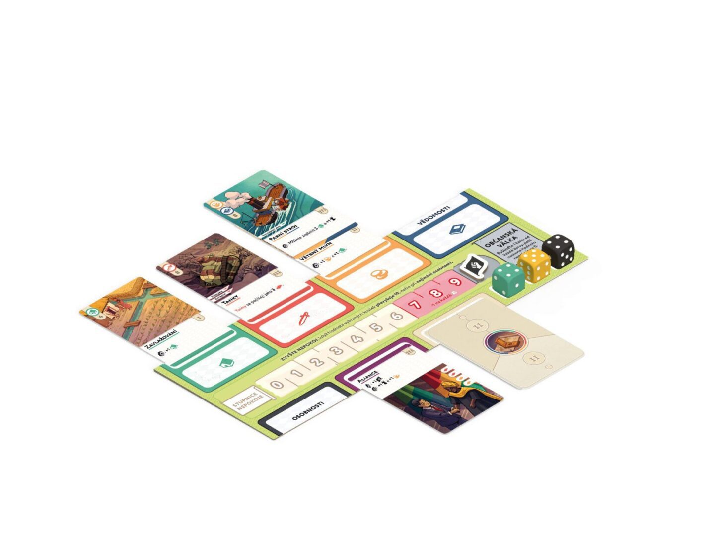 zanechte stopu v dějinách! Obsah balení: 1 pravidla 1 hrací plán 4 desky civilizací 5 kostkových oblastí 15 kostek 1 sáček na kostky 96 žetonů 200 karet