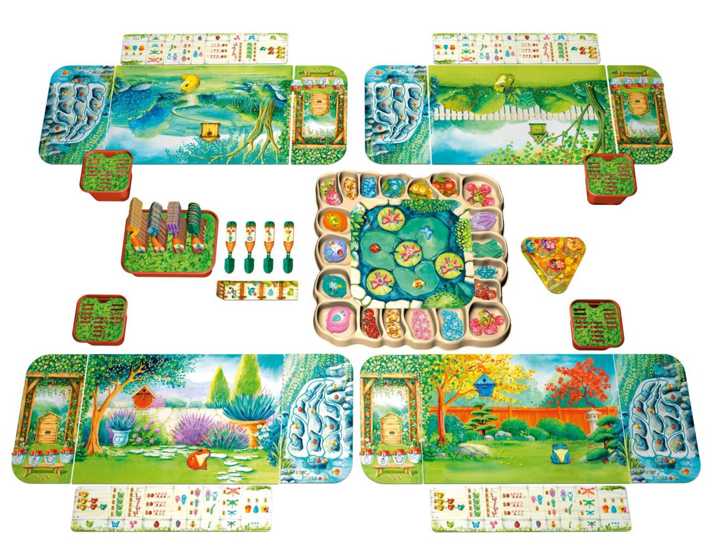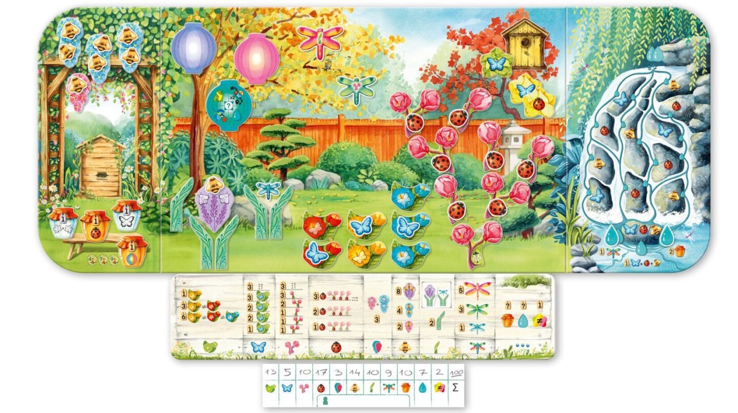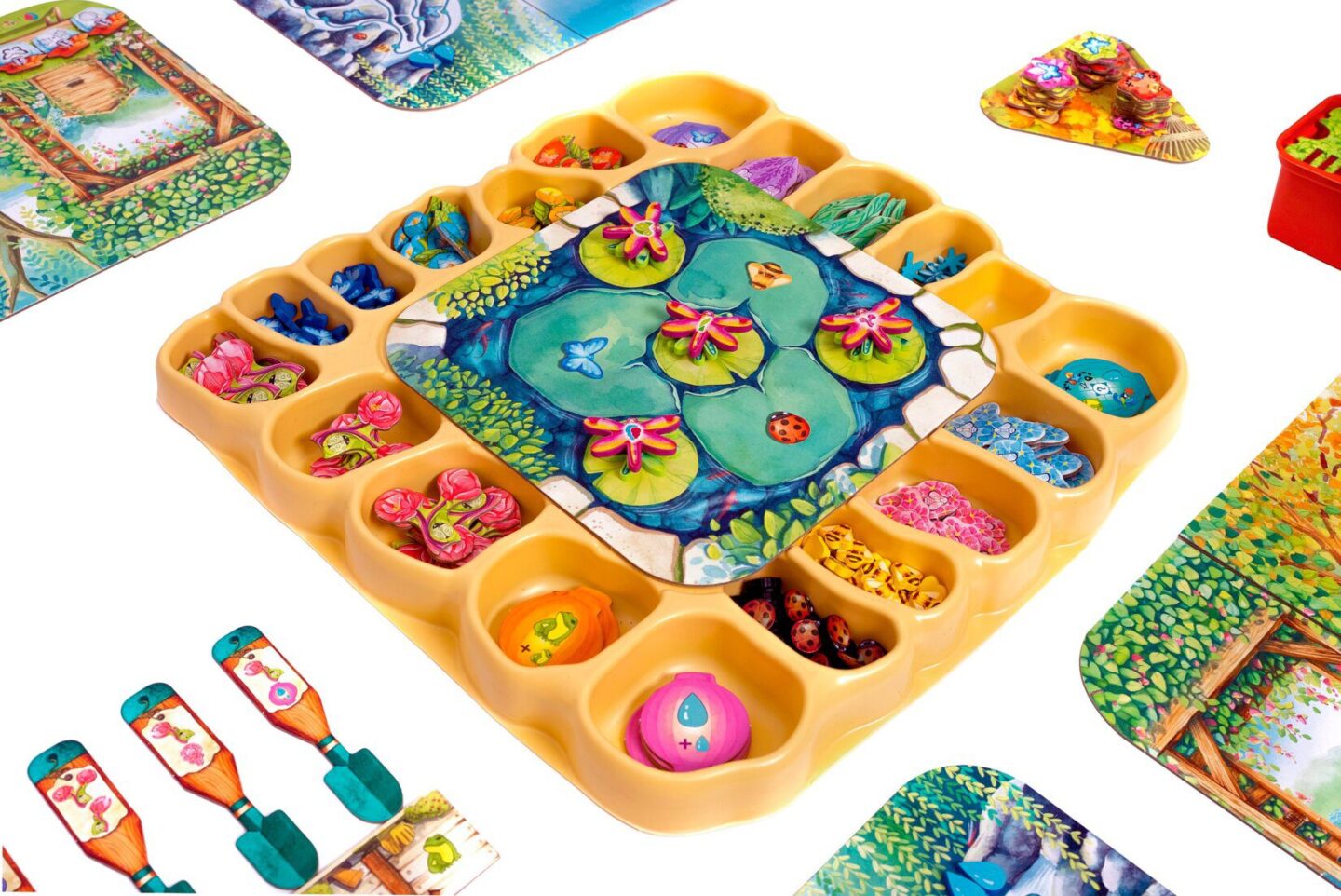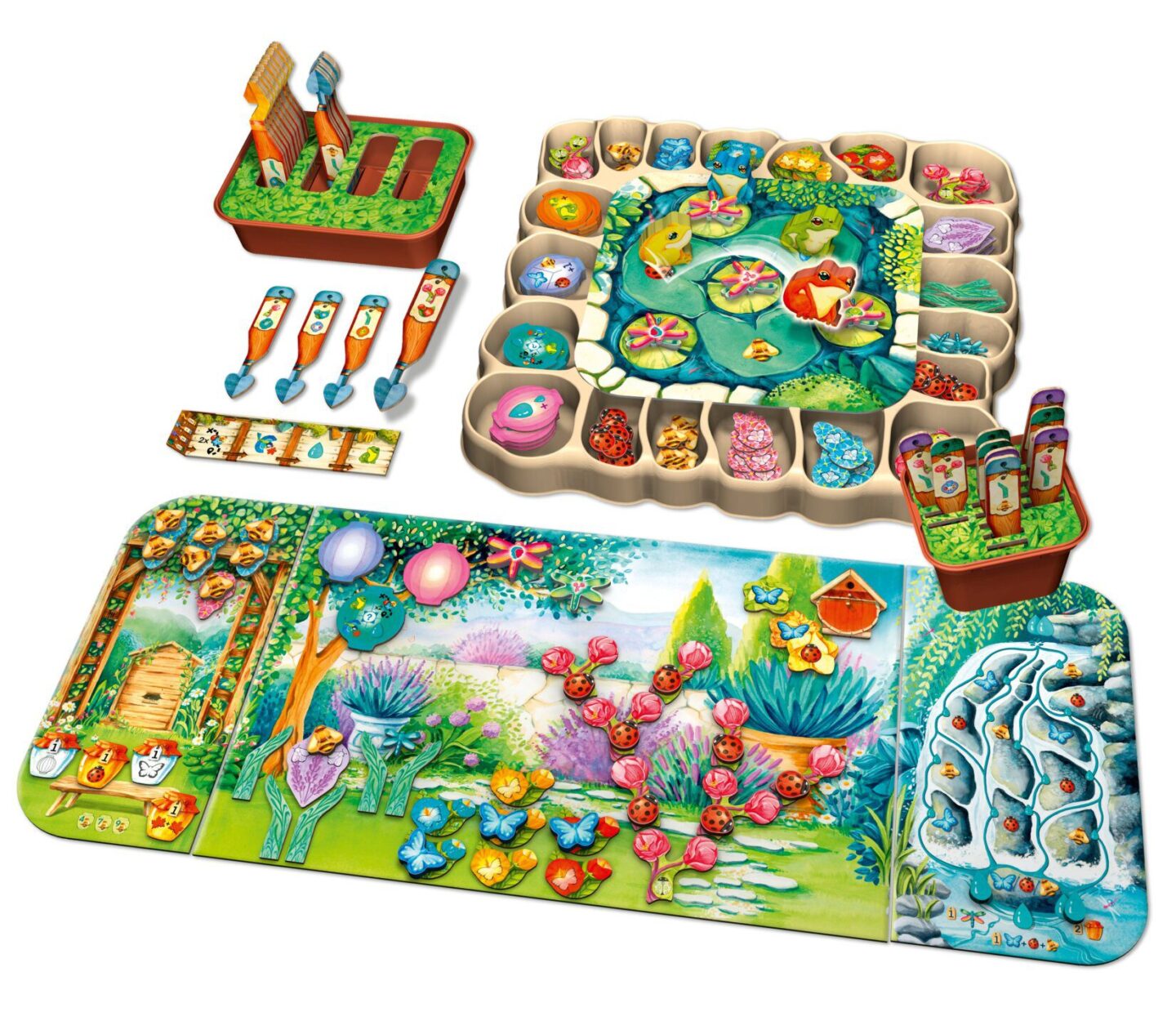 destičky vodní kaskády destička rybníku 4 bodovací desky destička listů 63 nářadí 107 žetonů rostlin 30 motýlů 30 berušek 40 včel 21 vážek 30 listů 16 lampionů 16 nádob na med 4 ptačí budky 4 květináče na nářadí držák na nářadí pořadač na žetony 8 kapek vody 4