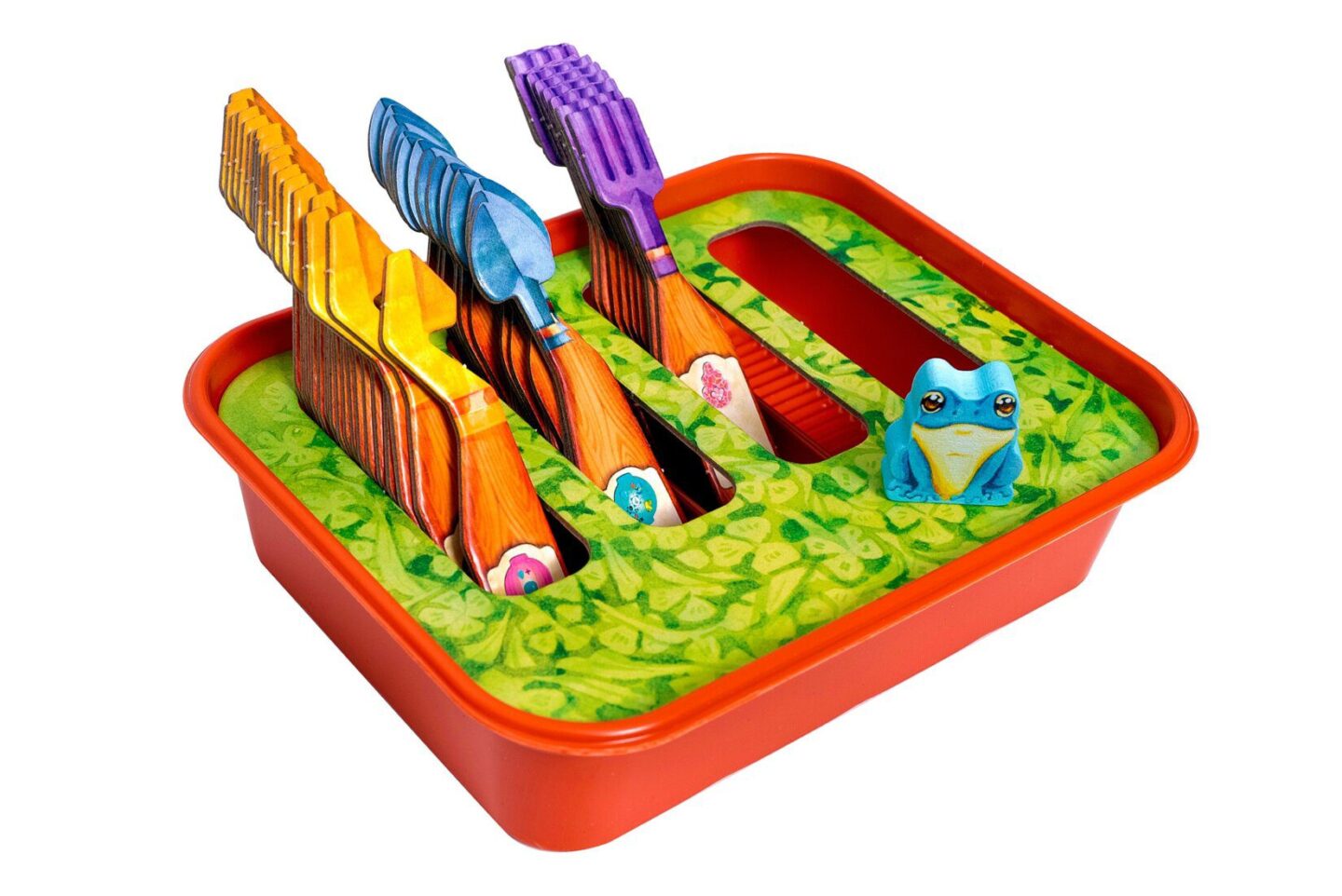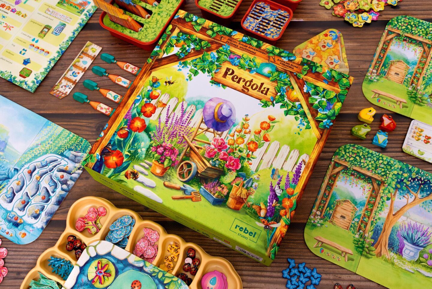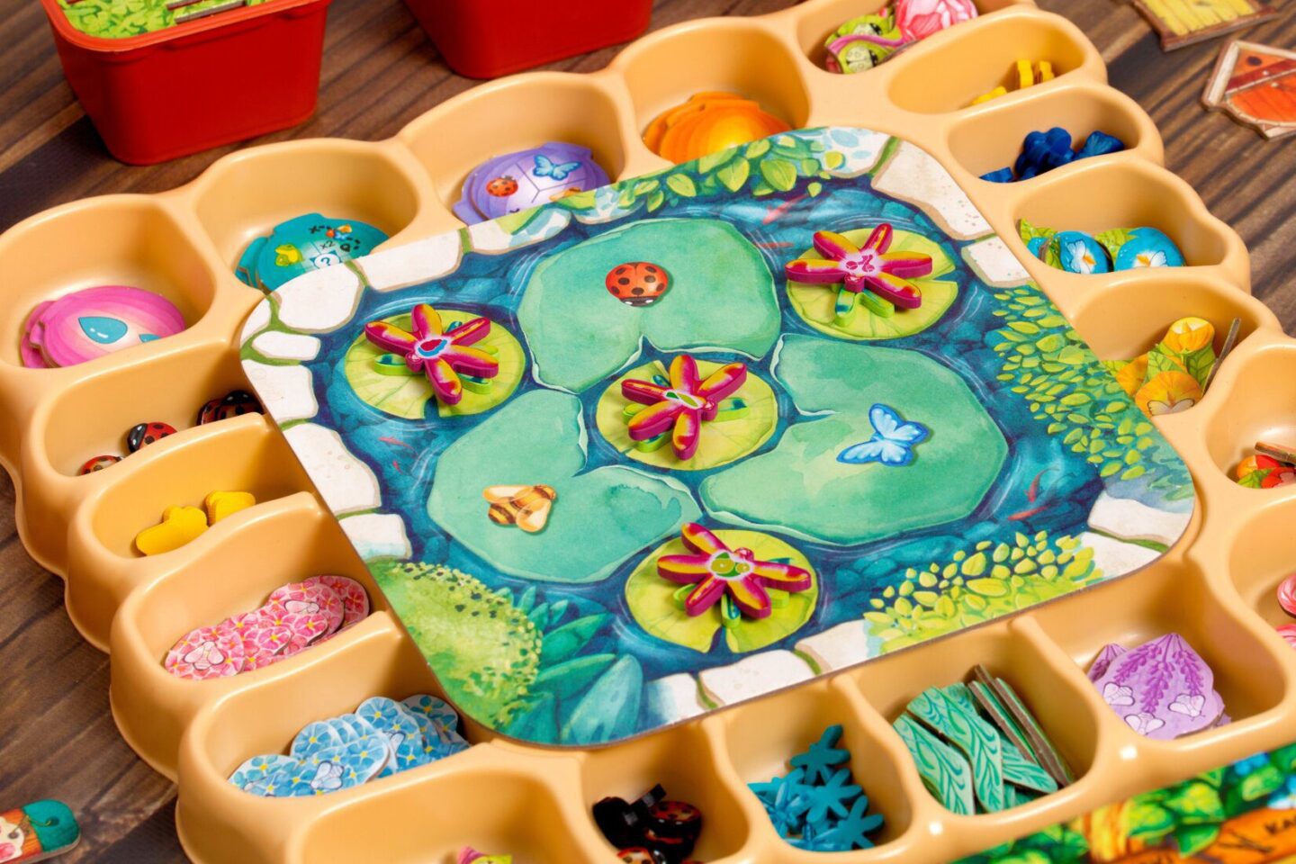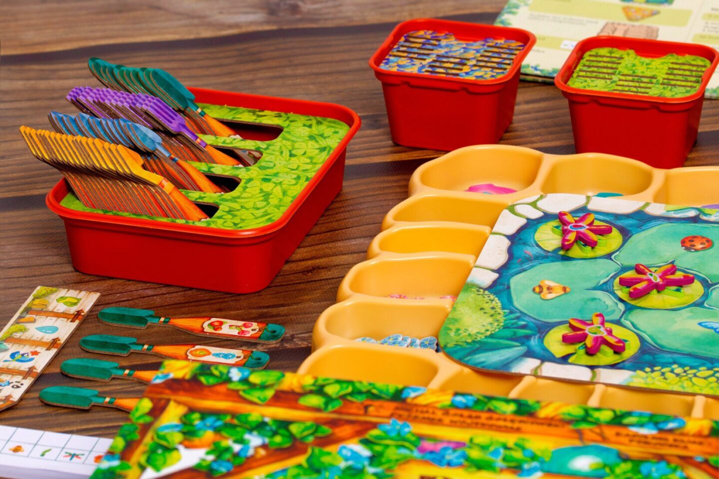 destičky vodní kaskády destička rybníku 4 bodovací desky destička listů 63 nářadí 107 žetonů rostlin 30 motýlů 30 berušek 40 včel 21 vážek 30 listů 16 lampionů 16 nádob na med 4 ptačí budky 4 květináče na nářadí držák na nářadí pořadač na žetony 8 kapek vody 4