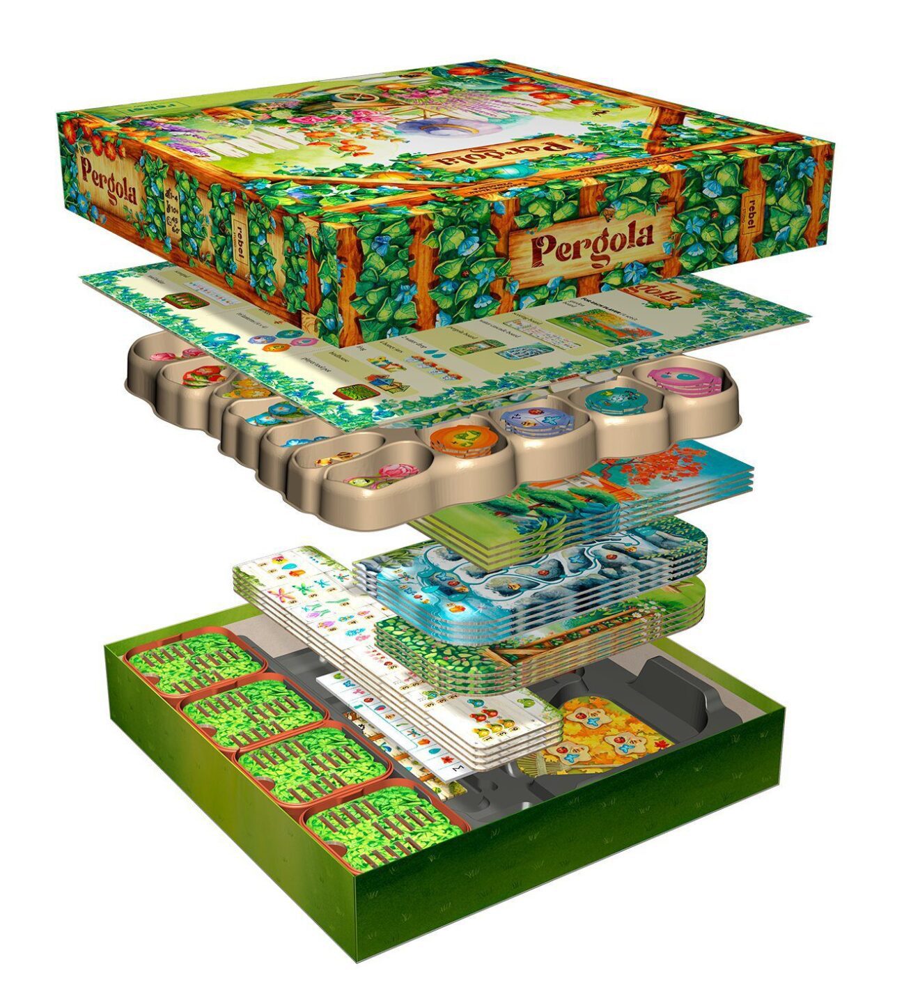 skok žáby, stékání vody nebo třepotání hmyzu. Každý z vás odehraje 15 kol, po kterých si sečtete získané body. Váš konečný výsledek se odvíjí od toho, jakou zahradu vytvoříte. Ve hře najdete i sólo mód. Obsah balení: destička akcí 4 desky zahrady 4 destičky pergoly 4