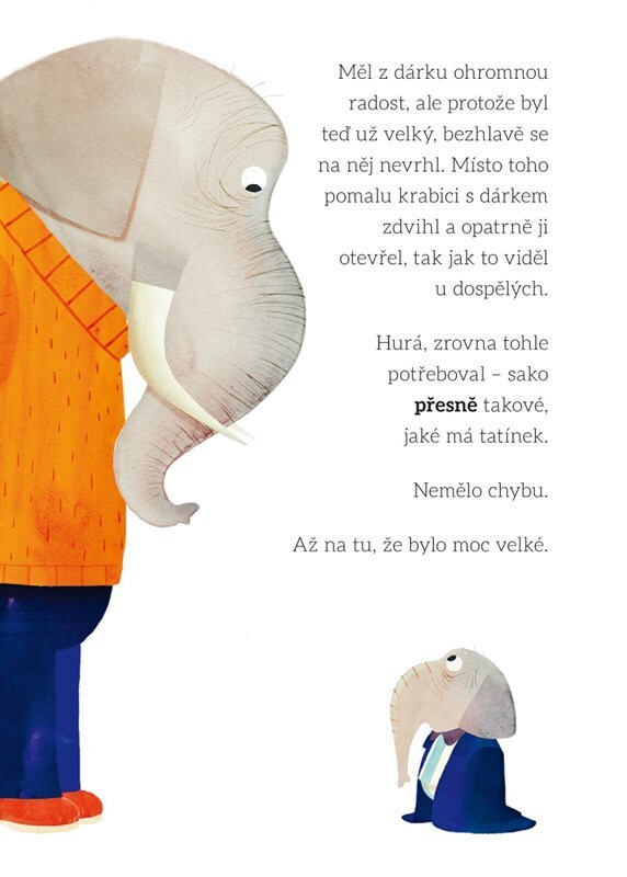 Když sloník Gustav dostane k narozeninám nové sáčko, je nadšený. Jenže jeho radost vystřídá zklamání ve chvíli, kdy si ho zkusí a zjistí, že je mu příliš velké. Je skutečně sako moc velké, nebo je Gustík moc malý? Podaří se tatínkovi v tenhle velký den rozptýlit synkovy...